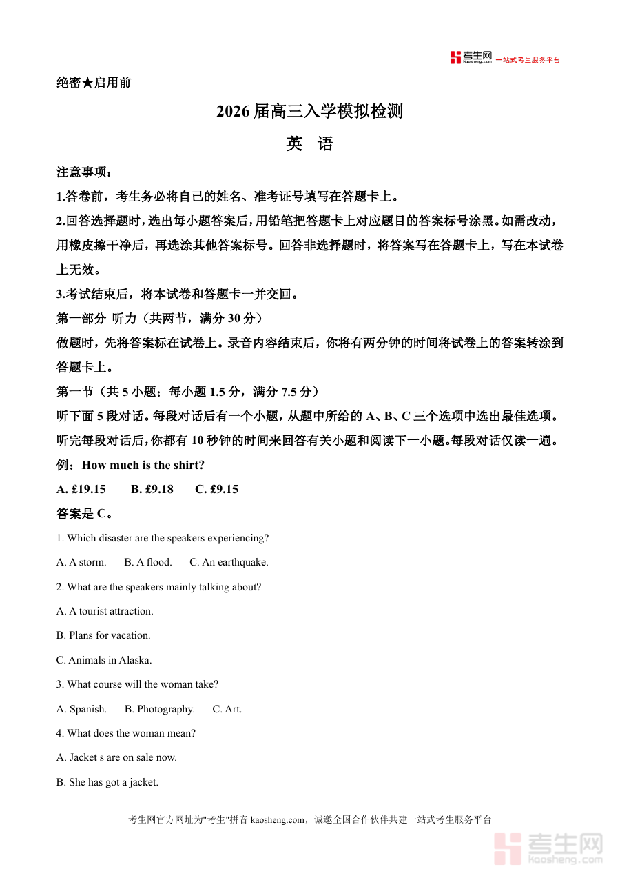 《精品解析:云南省临沧地区中学2025-2026学年高三上学期入学模拟检测英语试题(解析版)》是一份针对云南省临沧地区高三学生量身打造的高质量英语备考资料,核心定位为高三入学阶段的学业水平诊断与应试能力提升工具。该资料包含听力、阅读等完整考试模块(与高考英语题型一致),覆盖词汇、语法、阅读理解、听力理解等关键知识点;其特色亮点在于每道题目均配备详尽解析,不仅提供正确答案,还深入剖析错误选项成因、梳理相关语法规则与词汇用法,并给出针对性的解题技巧指导,帮助学生从根本上掌握考点与答题思路。