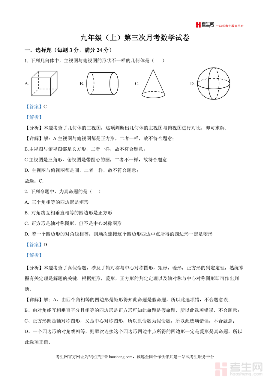 《精品解析:广东省深圳市宝安第一外国语学校2025-2026学年九年级上学期第三次月考数学试卷(解析版).docx》是一份针对深圳本地九年级学生数学备考需求打造专业资料。内容覆盖该次月考全部题型(8道选择、5道填空、7道解答),解析部分不仅呈现正确答案,更深度剖析命题意图,如三视图识别中的易错几何体判断、反比例函数与二次函数图像综合分析等考点,同时标注解题技巧与常见误区,贴合宝安一外及深圳初中数学教学考情特点。
