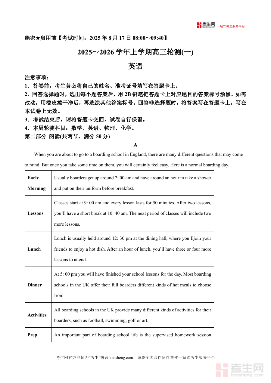 《精品解析:云南省临沧地区中学2025-2026学年高三上学期英语轮测(一)(解析版)》是一份聚焦本地高三英语备考的专业真题解析资料,核心内容包含本次轮测全卷试题及深度解析,覆盖阅读等关键模块。其特色亮点在于每题均结合题型定位(如推理判断题、细节理解题)、解题思路推导及考点延伸说明,例如阅读A篇针对英国寄宿学校生活的题目解析中,不仅明确答案依据,还点明应用文文体特征与应试技巧,助力学生精准把握真题命题规律。