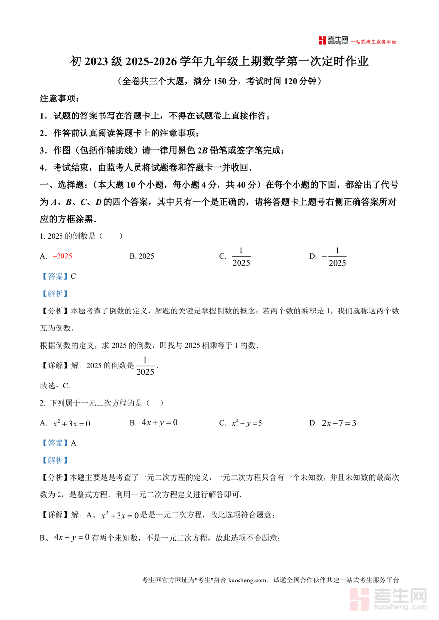本资料主要适用于重庆市广益中学九年级学生,也可供其他同类学校九年级学生参考使用。作为开学后首次定时作业解析版,它不仅能帮助学生快速查漏补缺,巩固开学初期核心知识,还能为后续阶段复习积累实战经验,具有不可替代的阶段性参考价值与长期备考指导意义,是九年级数学学习中不可或缺优质辅助资料。