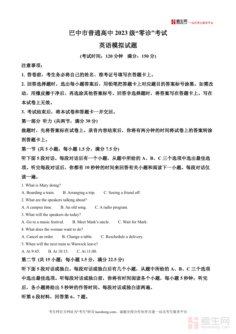 本资料的适用人群主要为巴中市普通高中2023级高三学生、一线英语教师及教育辅导机构。它的必要性在于作为零诊考前关键复习资料,帮助学生适应考试节奏、明确自身水平与不足;不可替代性体现在对本地考试特色的深度把握与专业解析的权威性;长期价值则是通过系统学习试题与解析,构建扎实英语知识体系,培养科学应试思维,为后续模拟考及高考打下基础,提升学习效果与竞争力。