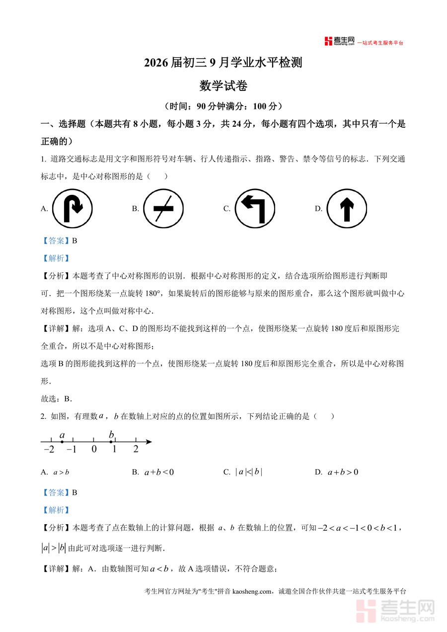 《精品解析:广东省深圳市百合外国语学校2025-2026学年上学期九年级9月月考数学试卷(解析版)》是一份针对该校九年级学生数学月考备考需求打造专业备考资料,包含完整试卷原题及各题型详细解析,覆盖选择题、填空题、解答题等全题型,解析部分不仅给出正确答案,还通过"分析""详解""点睛"模块拆解考点(如中心对称图形识别、一元二次方程根的判别式应用等),深度融合真题解析与知识拓展,帮助学生精准把握考试方向与核心考点。