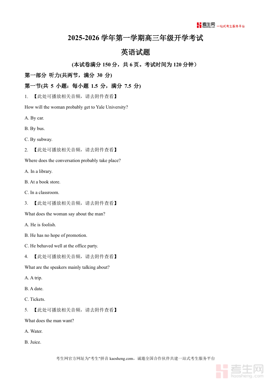 《精品解析:山西省山西现代双语学校等2025-2026学年高三上学期开学联考英语试题 (原卷版)》是一份针对高三学生英语备考的优质资源,核心定位为反映山西地区高三开学阶段联考水平的权威原卷资料。其主要内容涵盖高考英语考试的关键模块:听力部分包含两节共20小题(满分30分),涉及日常对话、长对话及独白等多种题型;阅读部分第一节包含A、B两篇短文,考查学生信息获取与理解能力;此外还包含后续未完全展示的完形填空、写作等题型。该资料特色亮点在于真实性与代表性——作为山西现代双语学校等多校联合考试原卷版本,它严格遵循高考命题规范,题型设置、难度梯度及考查重点贴合当地高三备考需求,且听力部分附带音频提示,能帮助学生模拟真实考试场景,提升听辨能力。