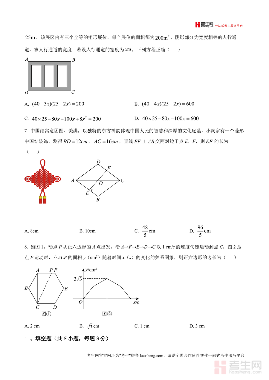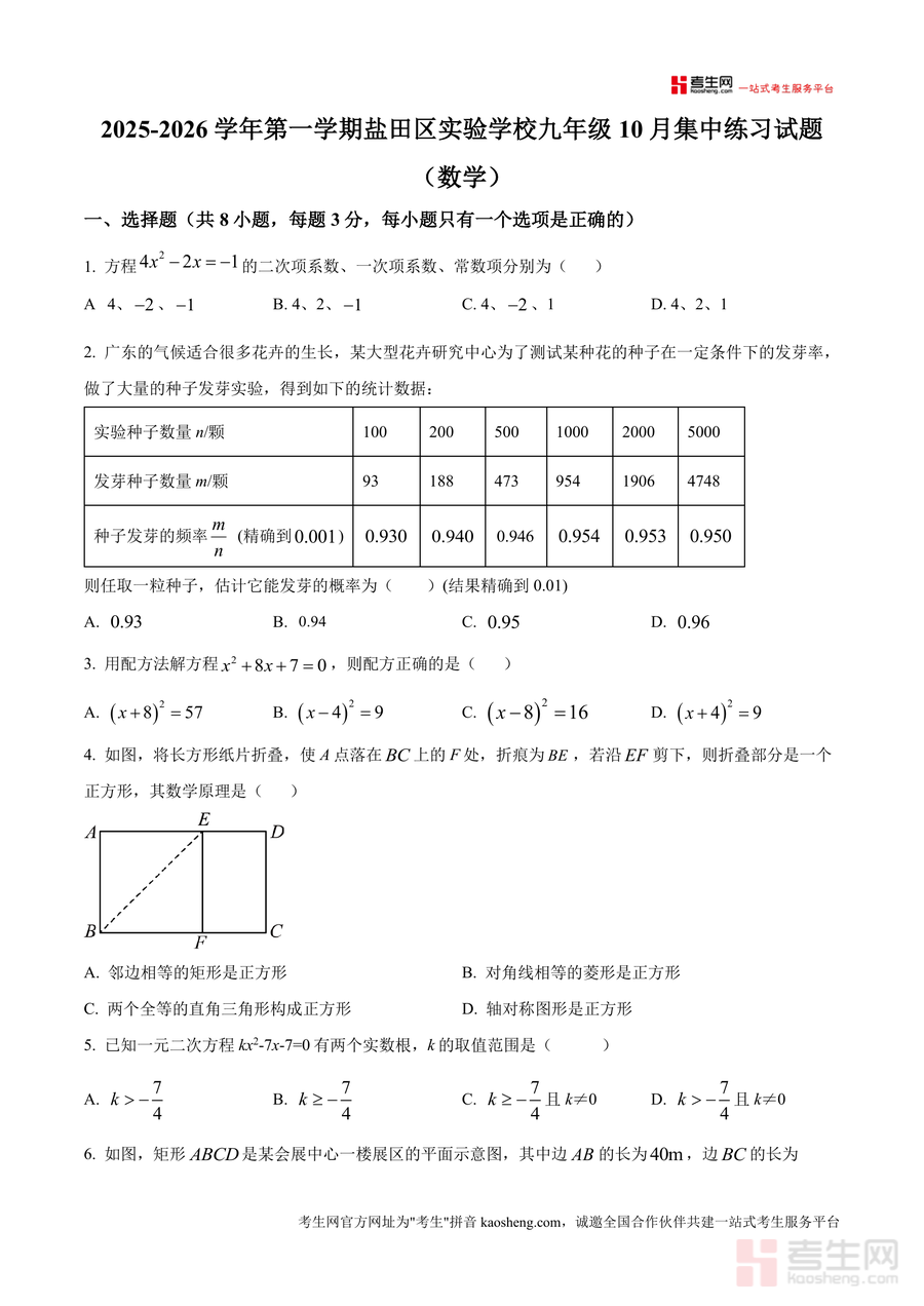 《精品解析:广东省深圳市盐田区实验学校2025-2026学年九年级上学期10月月考数学试卷(原卷版).docx》是一份针对深圳市盐田区实验学校九年级上学期数学阶段性检测的权威原卷资料,涵盖九年级上册核心知识点:一元二次方程(系数识别、配方法求解、根判别式及根与系数关系)、概率统计(种子发芽率估计、开关闭合概率计算)、特殊四边形(矩形折叠性质应用、菱形判定与计算、正六边形动点问题分析)等;题型设置全面覆盖选择题(8小题)、填空题(5小题)及解答题(19小题),贴合该校教学进度与校考命题方向,能直观反映学生阶段性知识掌握情况。