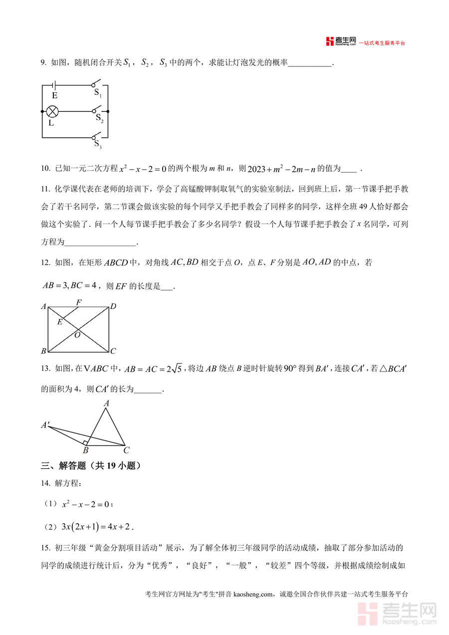 该资料核心用途为九年级学生提供校考真题练习素材、教师备课参考及命题分析依据;使用场景包括学生日常课后巩固训练、月考考前模拟测评,教师课堂例题选取与作业设计;用户价值在于帮助学生熟悉本校月考题型结构与难度梯度,精准定位二次方程应用、几何图形变换等薄弱模块;备考优势在于其原卷属性直接对接该校教学重点与命题风格,有效提升应试能力与解题技巧,助力学生高效备战月考。