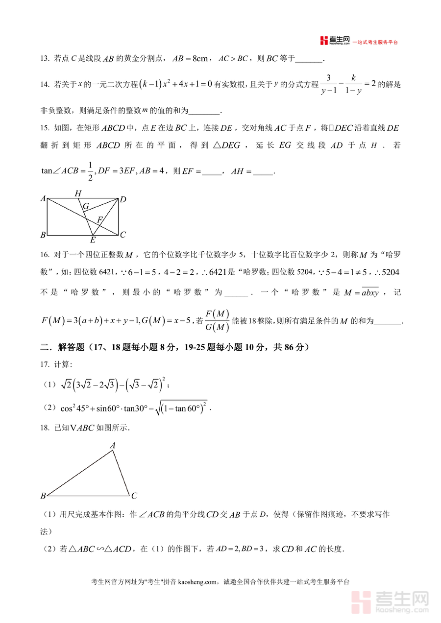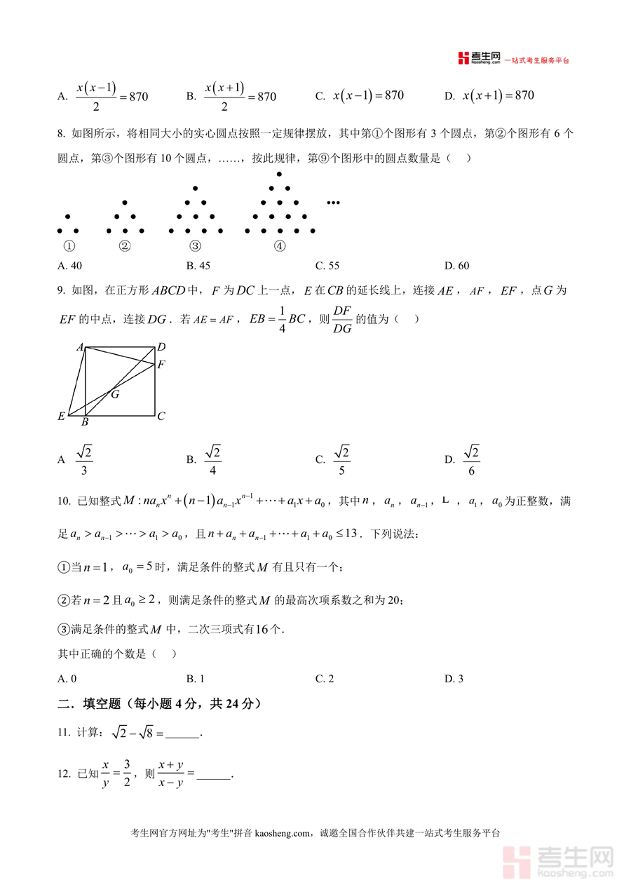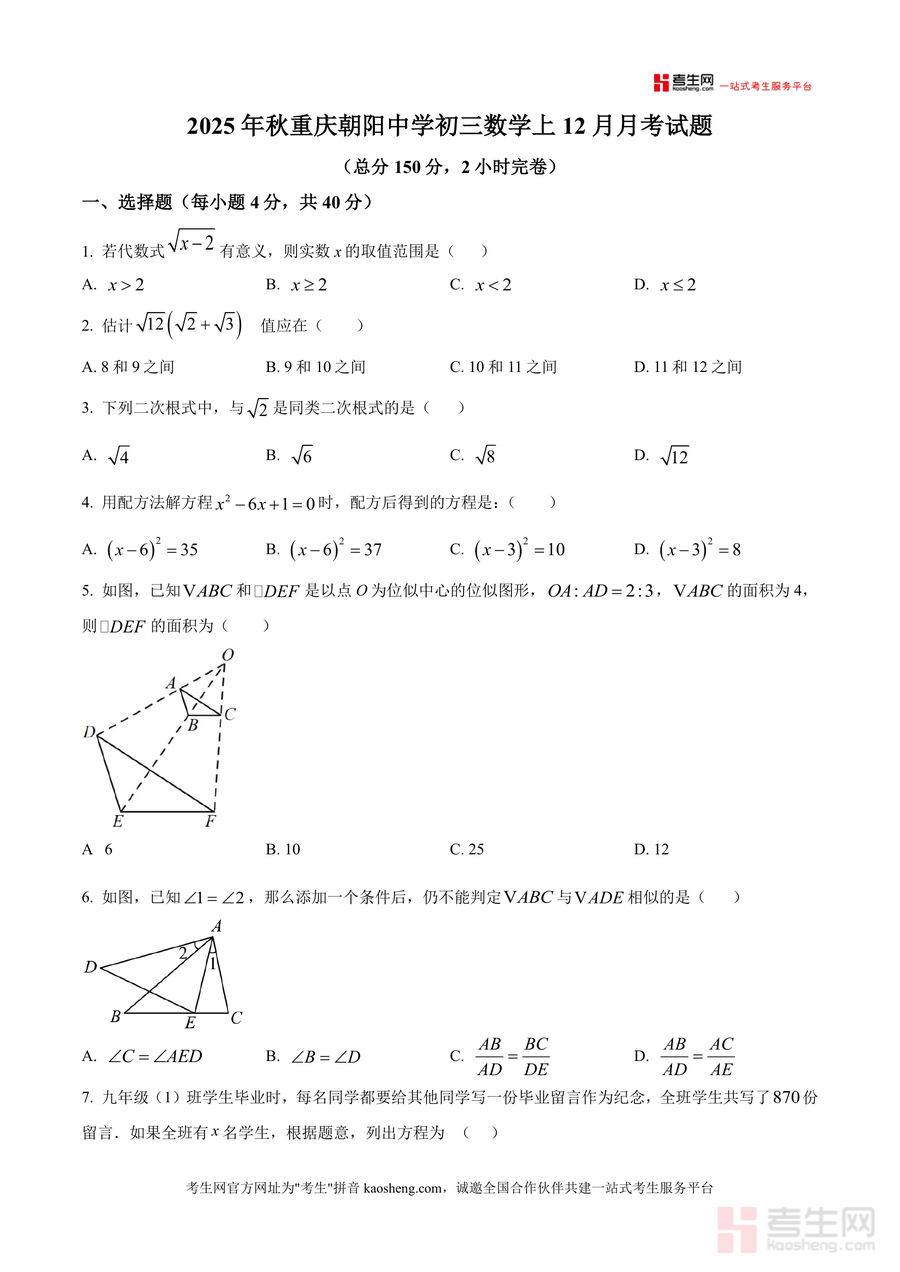 《精品解析:重庆市朝阳中学2025--2026学年九年级上学期12月月数学试题(原卷版).docx》是一份针对重庆市朝阳中学九年级上学期数学学科阶段性检测设计的高质量备考资料。主要内容涵盖选择题(10小题共40分)、填空题(6小题共24分)、解答题(9小题共86分)三大题型,覆盖二次根式性质与运算、一元二次方程解法与应用、相似三角形判定与性质、统计数据分析、几何图形变换等九年级上册核心知识模块。特色亮点在于严格遵循重庆本地中考命题导向,题型设置贴近实际教学进度,能精准反映学生阶段性知识掌握程度,为后续复习提供科学依据。