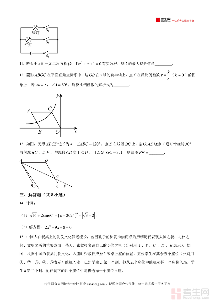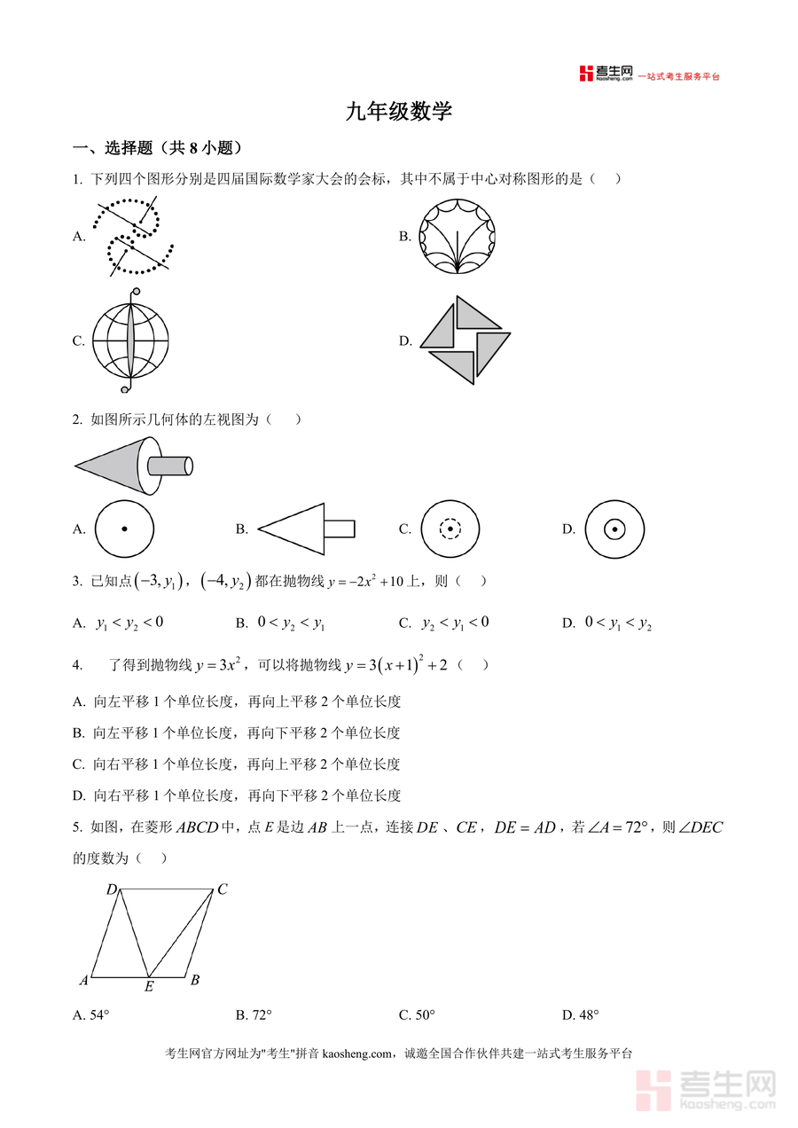 《精品解析:广东省深圳市盐田区深圳外国语学校 2025-2026学年上学期九年级数学12月月考试卷(原卷版).docx》是一份针对深圳外国语学校九年级学生数学阶段性检测的权威原卷资料,涵盖选择题(8小题)、填空题(5小题)、解答题(8小题)三大核心题型。内容覆盖二次函数图像变换与性质、几何图形旋转对称(菱形、正方形应用)、概率统计实际问题、一元二次方程求解及衍生问题等九年级上学期关键知识点;其特色在于严格贴合深圳中考考纲要求,深度匹配深外命题风格——注重知识综合应用与逻辑思维能力考查,题型设计兼具基础性与拓展性。