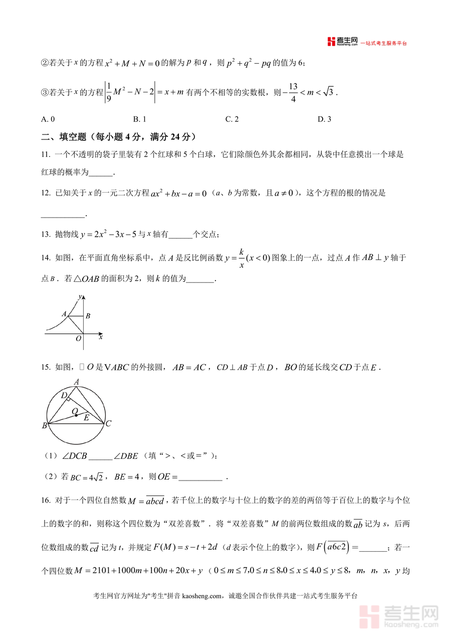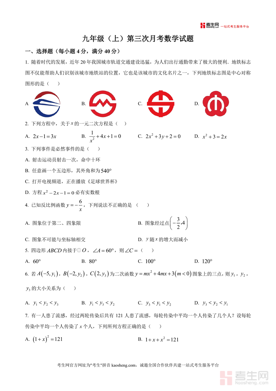 《精品解析:重庆市杨家坪中学2025-2026学年九年级上学期第三次月考数学试题(原卷版)》是一份针对该校九年级学生阶段性数学学习成果检测的真题资料,完整呈现第三次月考数学试题原貌,为后续真题解析提供基础。内容涵盖选择题(40分)、填空题(24分)、解答题(86分)三大题型共25道题目,覆盖中心对称图形识别、一元二次方程求解与根判别式应用、反比例函数性质、概率计算、圆与四边形综合等九年级上学期核心知识点;其特色亮点在于严格遵循该校教学进度与命题风格,保留试题原始结构与分值设置,还原真实考试场景。