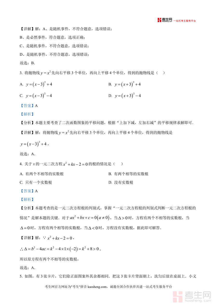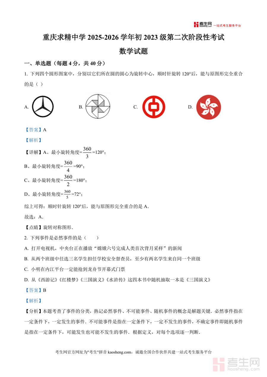 《精品解析:重庆市求精中学2025-2026学年上学期第二次月考九年级数学试题(解析版).docx》是一份针对九年级数学阶段性考试真题的专业备考资料与深度解析文档。文件涵盖单选题、填空题及解答题三大题型共二十余道典型题目,内容覆盖旋转对称图形判定、必然事件概念、抛物线平移规律、一元二次方程根判别式、概率计算及二次函数图像性质等九年级核心知识点。其特色亮点在于每道题目均配备详细分析思路、分步解答过程及考点点睛(如旋转对称图形最小旋转角计算方法、二次函数顶点式应用技巧),既还原真题原貌,又深入剖析考点本质与解题逻辑,属于高质量的真题解析类资料。