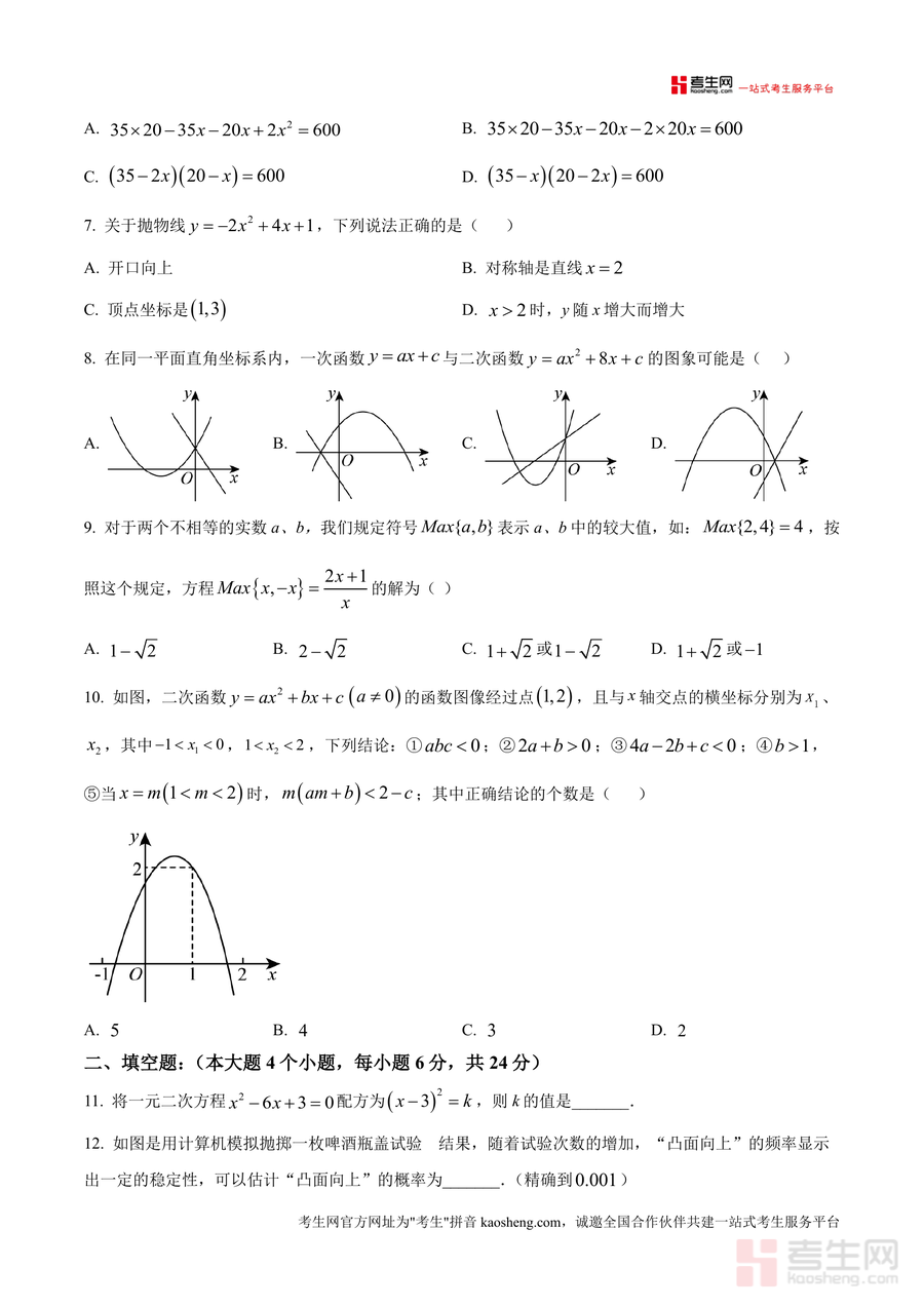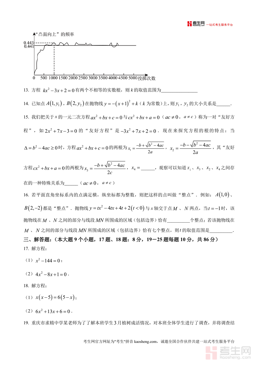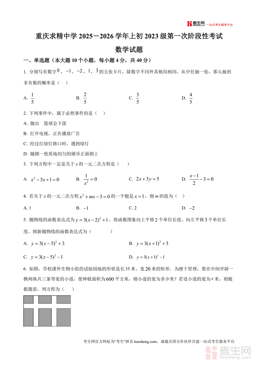 《精品解析:重庆市求精中学2025-2026学年九年级上学期第一次月考数学试题(原卷版).docx》是一份针对九年级学生数学阶段性备考需求设计的权威真题资料,涵盖单选题、填空题、解答题三大题型,内容覆盖概率计算、一元二次方程求解、抛物线性质分析、统计概率应用、实际问题建模等核心知识点。该资料严格遵循重庆本地教学考纲与求精中学月考命题规律,题型设置梯度合理,从基础概念到综合应用层层递进,能帮助学生精准把握阶段学习重点与命题方向,是兼具实用性与指导性的备考资料。