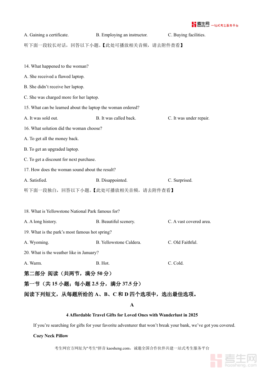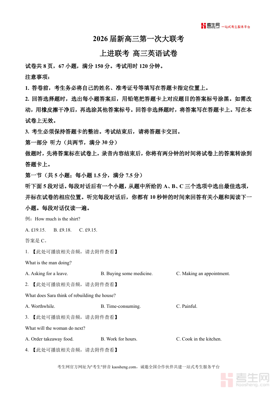 《精品解析:江西省2025-2026学年高三上学期第一次大联考英语试题(原卷版).docx》是一份针对江西2026届高三学生打造的高质量联考真题原卷备考资料。文件严格遵循高考英语命题规范与江西本地联考考情,包含听力、阅读等核心模块,试卷共8页67小题,满分150分且考试用时120分钟,完整还原了联考的题型结构与难度梯度。其特色亮点在于贴合新课标对英语核心素养的要求,听力部分配备音频附件,阅读材料涵盖多样话题类型,能帮助使用者真实感受联考考试场景与命题方向。