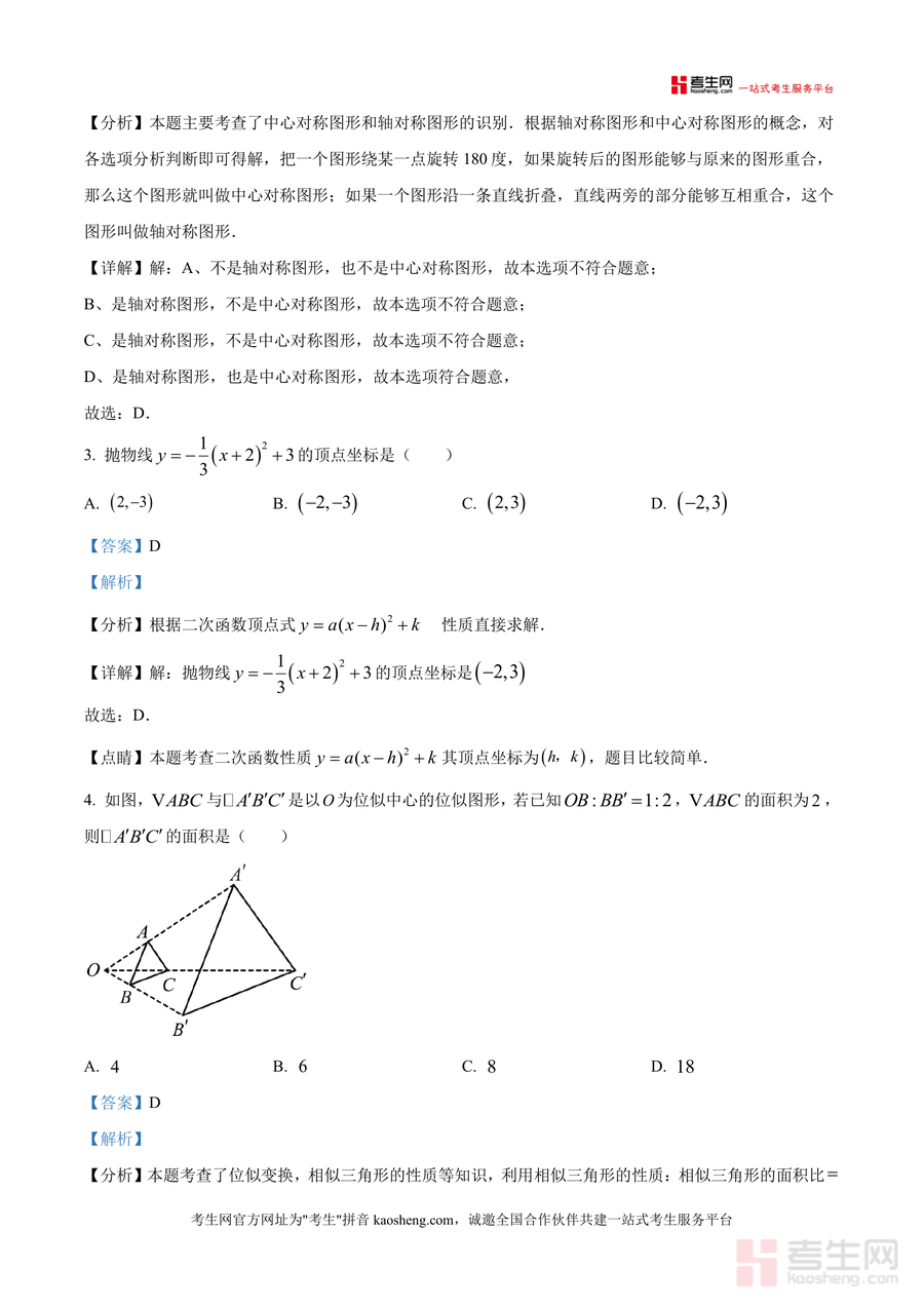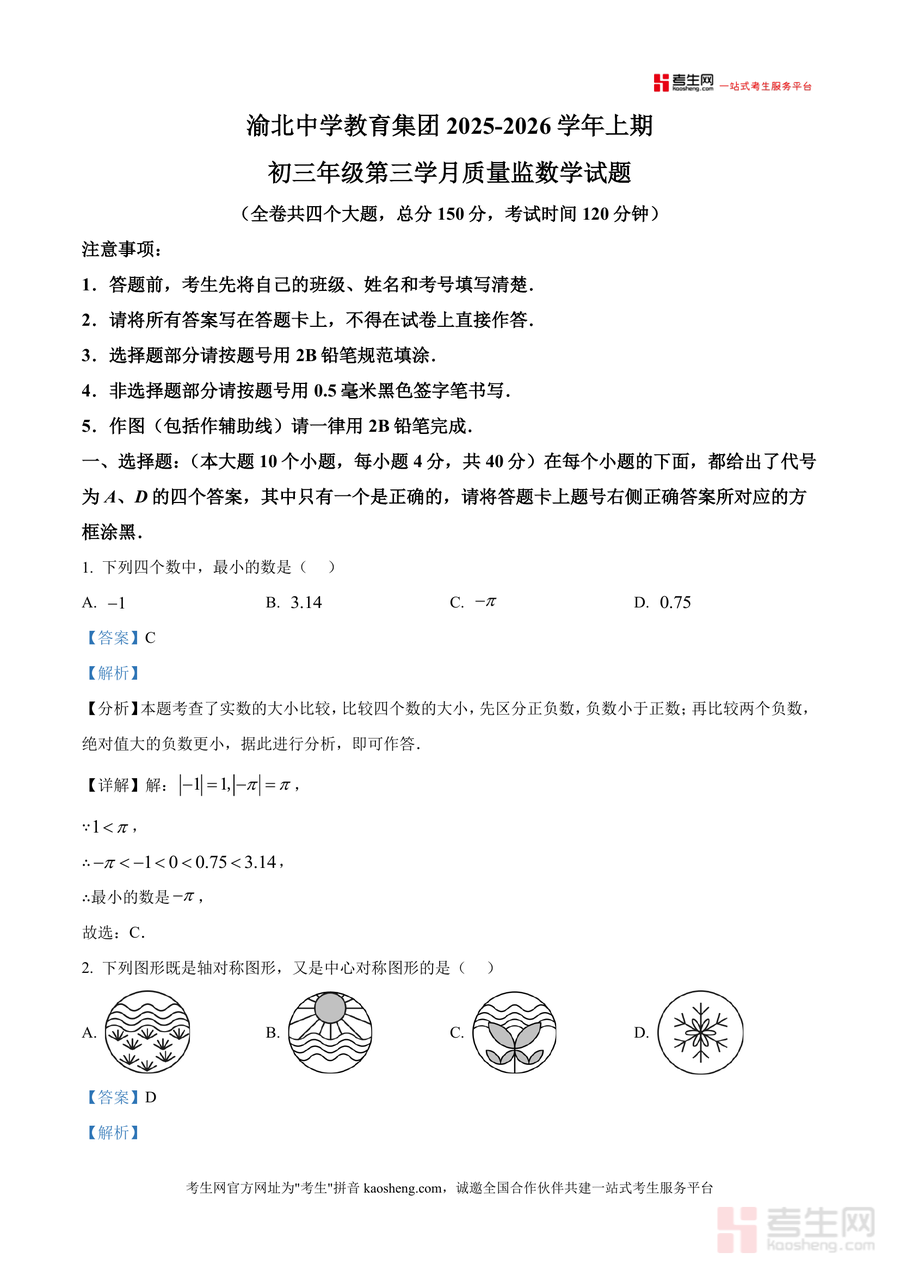 《精品解析:重庆市渝北中学2025-2026学年九年级上学期11月月考数学试题(解析版).docx》是一份针对九年级学生数学学科阶段性备考需求的优质真题解析资料。文件包含全卷四大题共150分试题及对应详细解析,覆盖实数大小比较、轴对称与中心对称图形识别、二次函数顶点坐标、位似图形性质、无理数估算等核心考点;解析部分采用"分析-详解-点睛"三步法,如位似图形题结合相似三角形面积比规律推导结果,无理数估算题通过不等式性质缩小范围,帮助学生理解考点本质与解题逻辑。