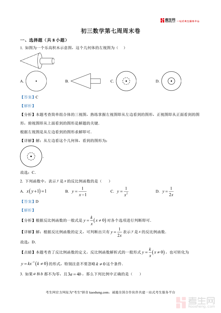 《精品解析:广东省深圳市红岭中学2025-2026学年九年级上学期第七周周测数学试卷(解析版).docx》是一份针对深圳红岭中学九年级上学期阶段性学习成果检测设计 的数学真题解析资料。其核心内容覆盖选择题、填空题及解答题三大题型,包含几何体视图判定、反比例函数定义、比例性质应用、正方形判定定理、概率计算等九年级上册核心知识点;特色亮点在于每道题目均配备详尽考点分析与解题思路——如对反比例函数题目的定义解读、相似三角形判定方法梳理,以及概率计算中的树状图应用指导等,并通过“点睛”环节提炼解题技巧,帮助学生构建完整知识体系。