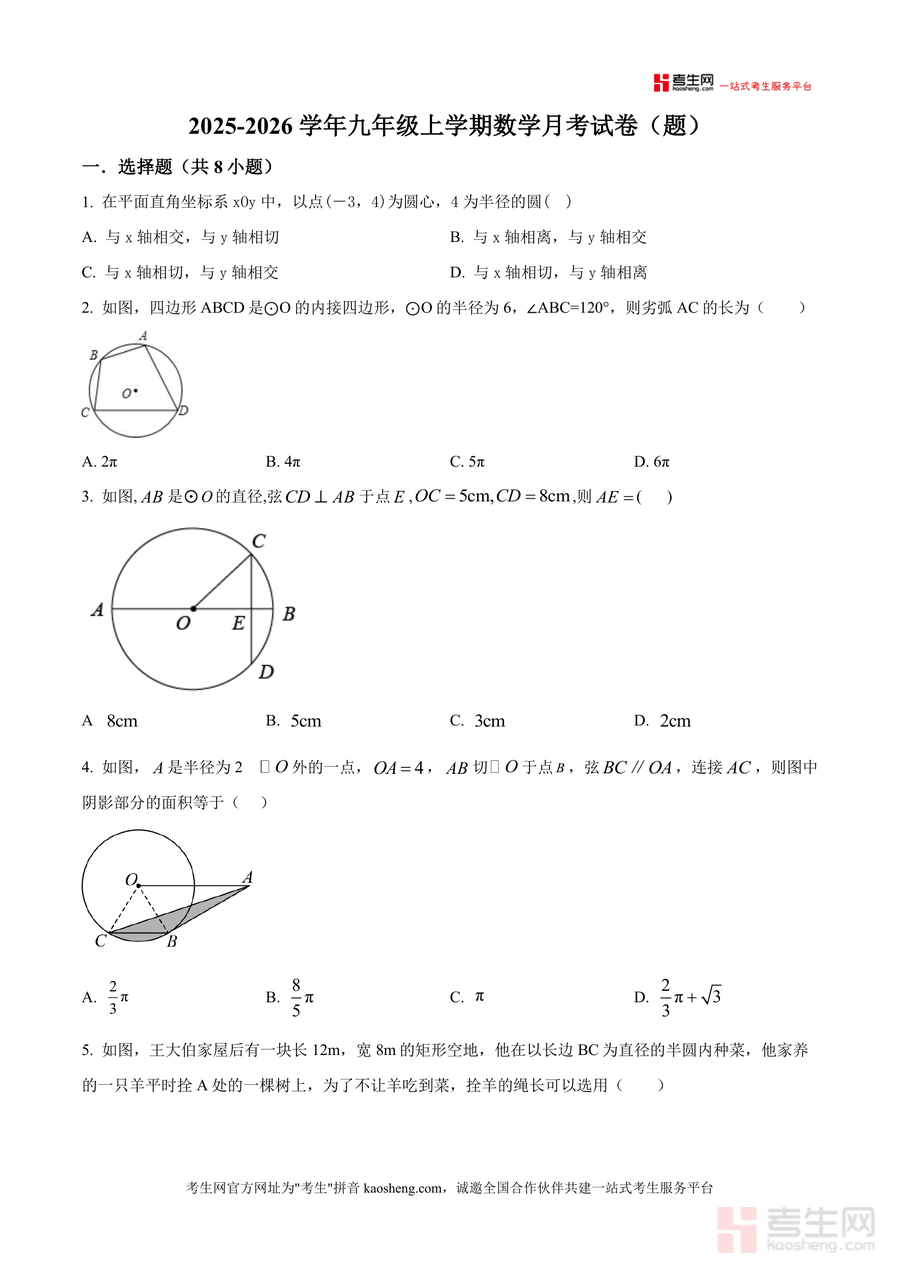 《精品解析:广东省深圳市翠茵学校2025-2026学年九年级上学期12月月考数学试卷(原卷版)》是一份针对深圳翠茵学校九年级学生月度数学学习检测设计的备考资料。该试卷包含选择题8道、填空题5道、解答题7道,内容聚焦圆的核心知识点,如圆的切线判定、弧长计算、内心与外心距离、圆内接四边形性质等;特色在于贴合深圳本地教学进度与考试题型方向,题目设置兼顾基础与能力提升,能有效反映学生对圆模块知识的掌握程度。
