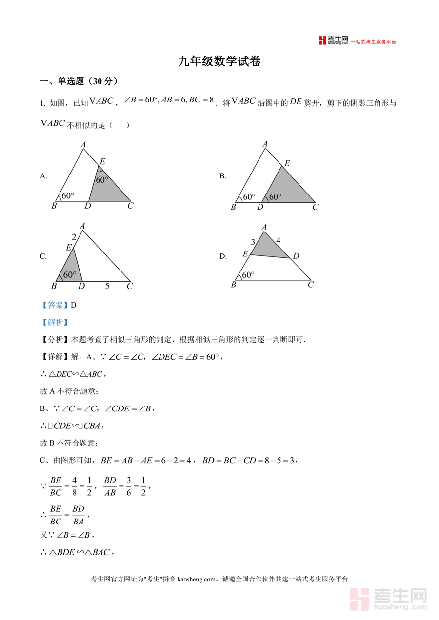 该资料核心用途为辅助学生课后针对性复习及教师备课参考使用场景包括月考后错题订正考前冲刺训练及日常知识点巩固对学生而言通过真题解析可掌握解题技巧提升应试能力尤其是对易错题(如相似三角形判定误区位似变换坐标计算)深度剖析能有效查漏补缺其渗透转化思想数形结合等数学方法助力构建系统知识体系增强备考优势