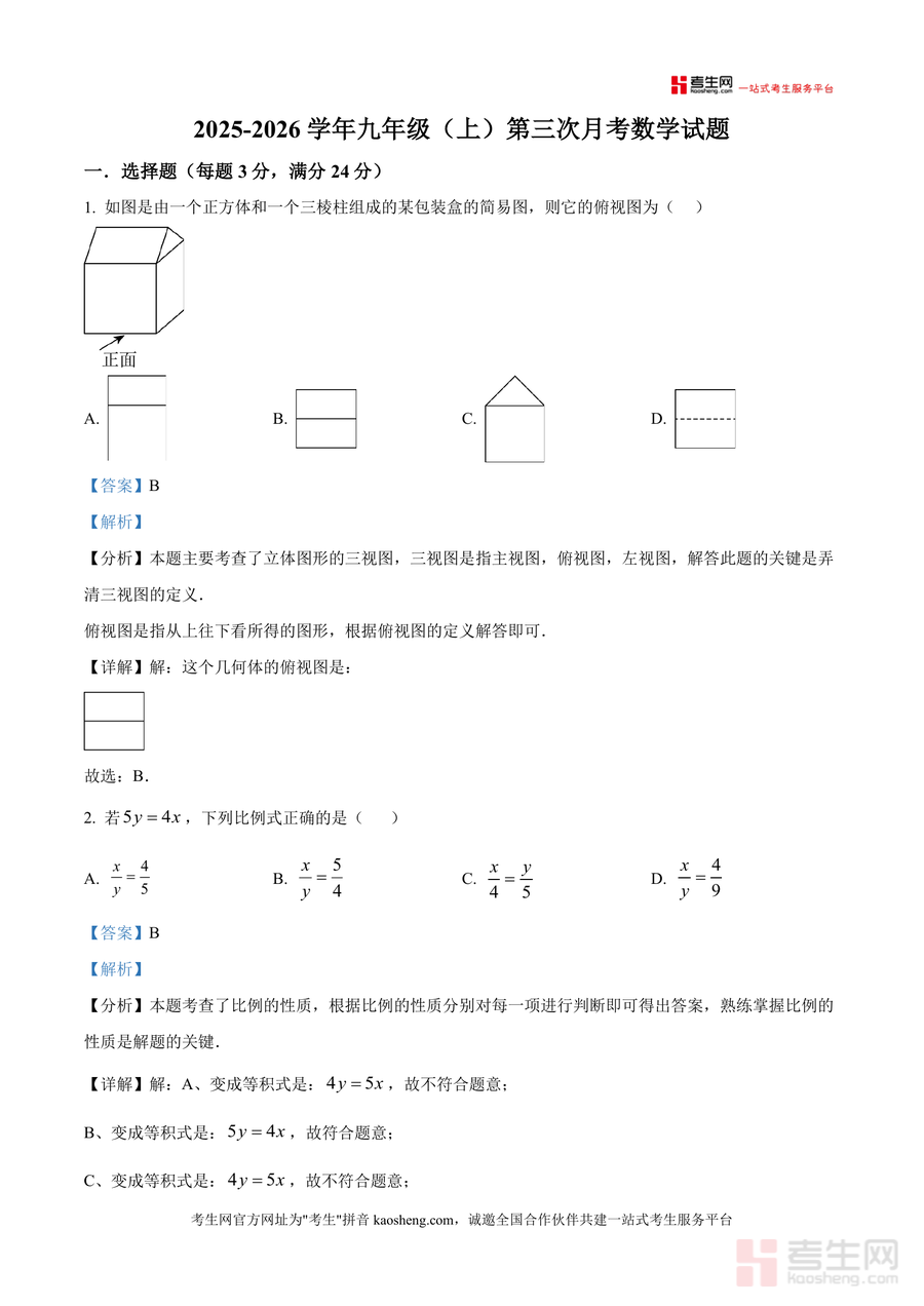 《精品解析:广东省深圳市龙华区新华中学教育集团2025-2026学年上学期九年级第三次月考数学试题(解析版).docx》是一份针对九年级数学阶段性学习检测设计开发高质量真题解析资料。该资料包含第三次月考完整试题及逐题深度解析,覆盖选择题(如立体图形三视图、比例性质)、填空题(如概率计算、矩形判定条件)、解答题(如一元二次方程求解、统计图表分析)三大题型,涉及相似三角形应用、反比例函数性质、特殊平行四边形判定等核心考点,每道题均配备详细分析思路、考点归纳及易错点提示,帮助使用者精准把握知识重点与解题方法。
