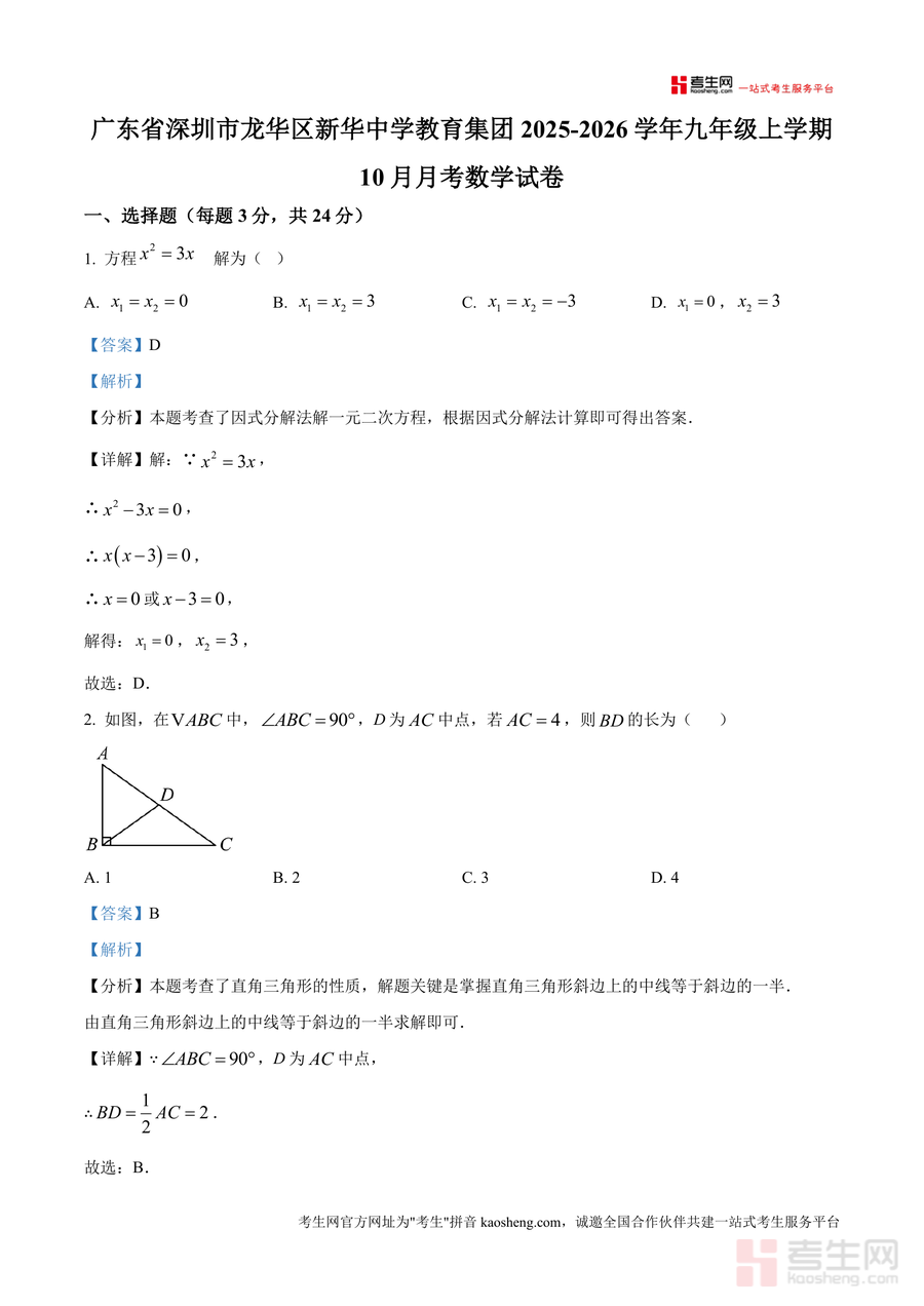 《精品解析:广东省深圳市龙华区新华中学教育集团2025-2026学年九年级上学期10月月考数学试卷(解析版)》是一份针对本地校考真题进行深度剖析的专业教学辅助资料。其核心内容覆盖选择题、填空题及解答题全题型,包含因式分解法解一元二次方程、直角三角形斜边中线性质、几何概率计算、菱形与正方形综合应用等九年级上册核心考点;特色亮点在于每道题均配备详尽解析——不仅呈现正确答案与步骤推导,还融入考点定位、解题思路梳理及易错点警示,为真题解析提供多维度支撑,助力学生精准把握知识内核。