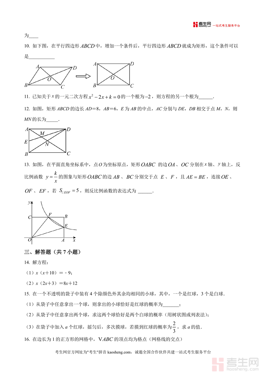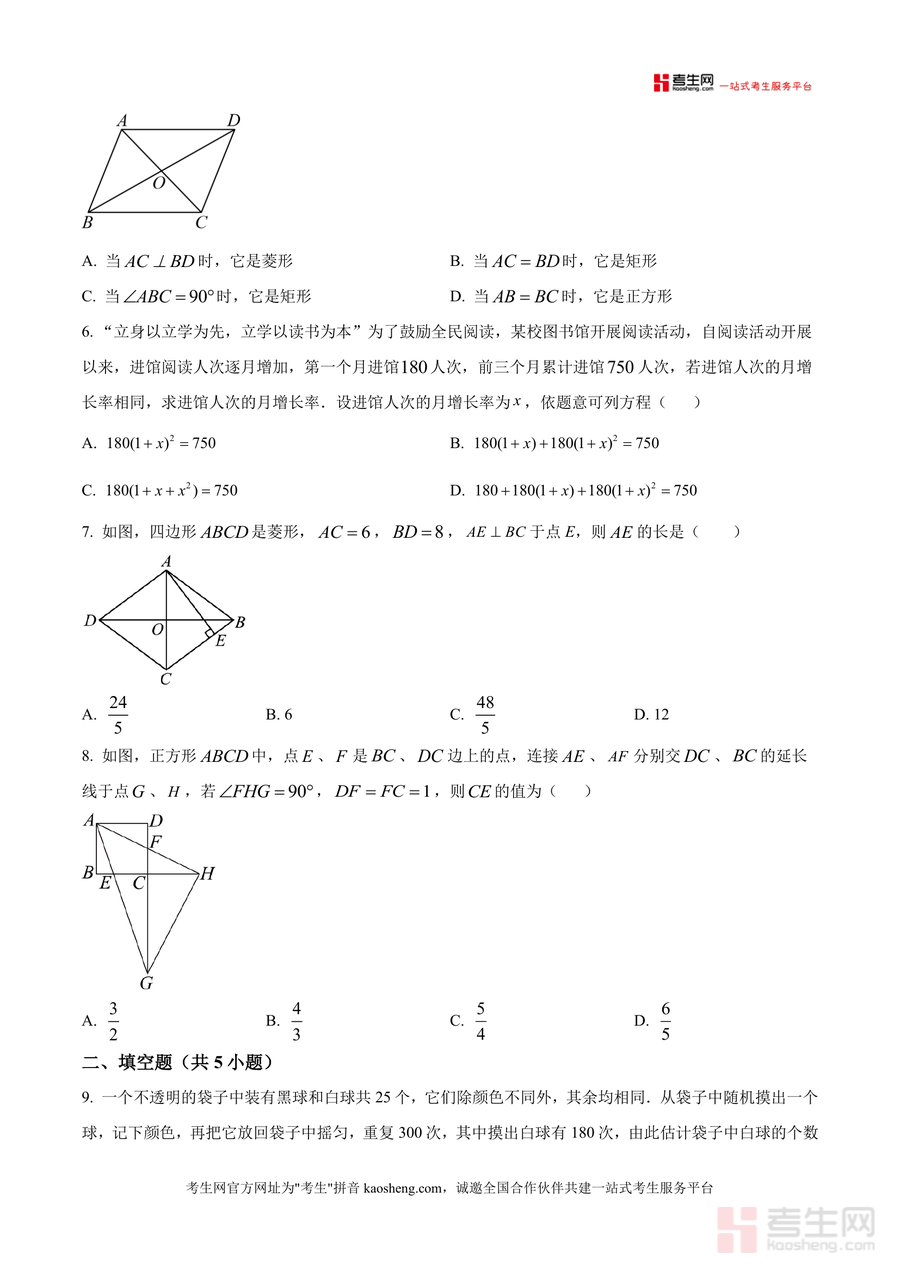 《精品解析:广东省深圳市龙华区新华中学教育集团 2025-2026学年上学期九年级数学1月月考试卷(原卷版).docx》是一份聚焦九年级数学阶段性学业评估的优质备考资料。该试卷包含选择题8道、填空题5道、解答题7道三大题型,覆盖图形与几何(如鸡心杯俯视图判断、菱形性质应用、矩形判定条件)、函数(反比例函数性质分析、一次函数与反比例函数综合)、概率统计(摸球概率估计与计算)、方程与不等式(一元二次方程求解)及实际应用(直播购物利润问题、杠杆原理应用)等核心知识模块。其特色亮点在于题目设计贴合深圳本地教学进度与中考命题趋势,融入生活情境与数学文化元素,题型结构与分值分布对标中考标准,能真实反映区域教学重点。
