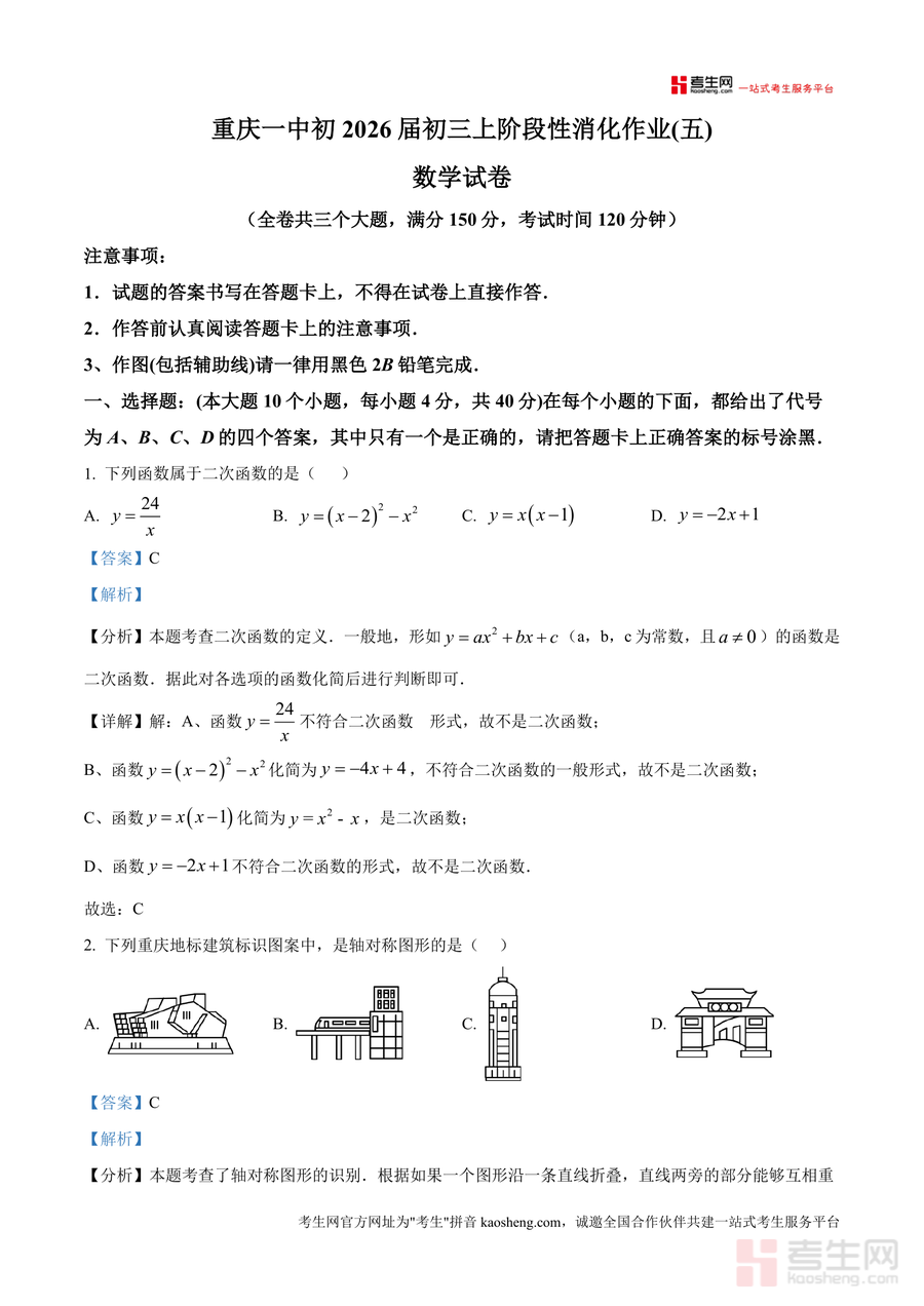 《精品解析:重庆市第一中学校2025-2026学年上学期九年级阶段性消化作业(五)数学试卷(解析版)》是一份针对重庆一中初2026届九年级学生上学期阶段性复习设计 的专业备考资料,涵盖全卷三个大题(选择题10题、填空题6题、解答题9题)共150分的完整内容及详细解析。该资料核心亮点在于每道题目均配备考点分析、解题步骤及思路拓展——如二次函数定义判断、轴对称图形识别、位似图形面积比计算等高频考点,解析过程不仅给出标准答案,还融入命题意图解读与易错点提示,帮助使用者深度理解知识点应用。