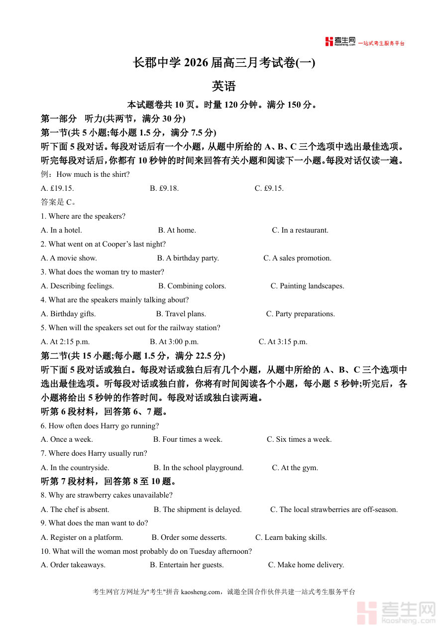 该试题核心用途是帮助高三学生快速适应高三考试节奏与难度:通过120分钟限时完成模拟真实考场环境培养时间管理能力;借助多样化题型暴露知识盲区(如听力细节捕捉、阅读主旨归纳短板)。使用场景广泛:学生可作开学自我评估工具明确复习重点;教师可用于课堂测试或作业掌握班级学情;家长可协助孩子阶段性练习复盘。备考优势显著——作为长郡中学官方开学试题,命题思路与高考高度契合,让学生提前熟悉高考考点与题型结构,有效提升复习效率与考试信心。