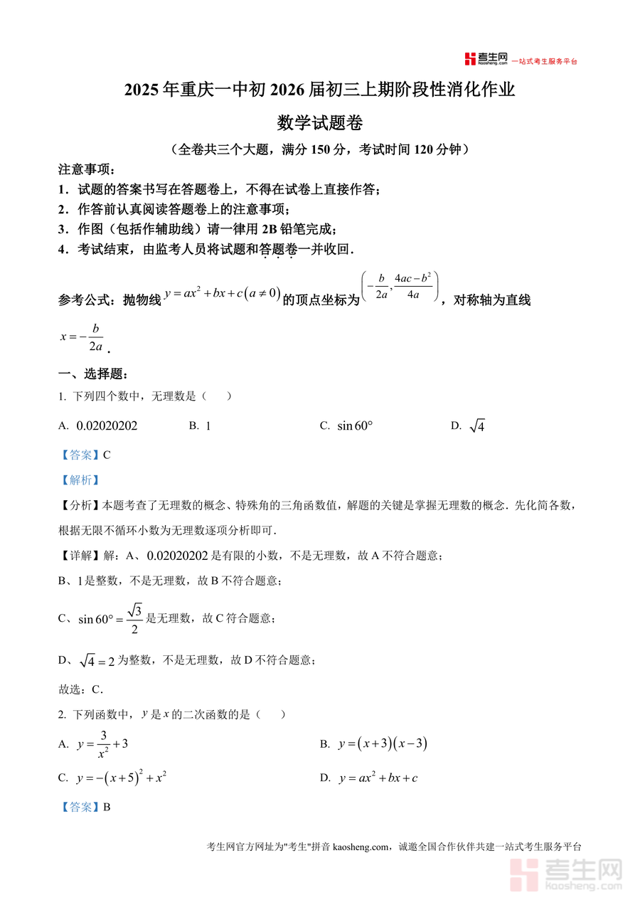 《精品解析:重庆市第一中学校2025-2026学年九年级上学期10月月考数学试题(解析版).docx》是一份针对重庆一中初三年级学生阶段性复习设计专业备考资料。文件包含完整月考数学试题原题及逐题详细解析,覆盖九年级上学期前阶段核心考点如二次函数性质、相似三角形应用、无理数概念等。其特色亮点在于解析部分采用"分析-详解-点睛"三步法拆解解题思路,不仅提供标准答案还深入讲解考点本质,同时融入教材关联知识点实现知识迁移与巩固。