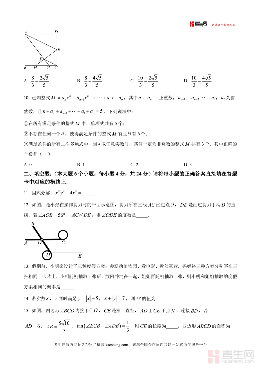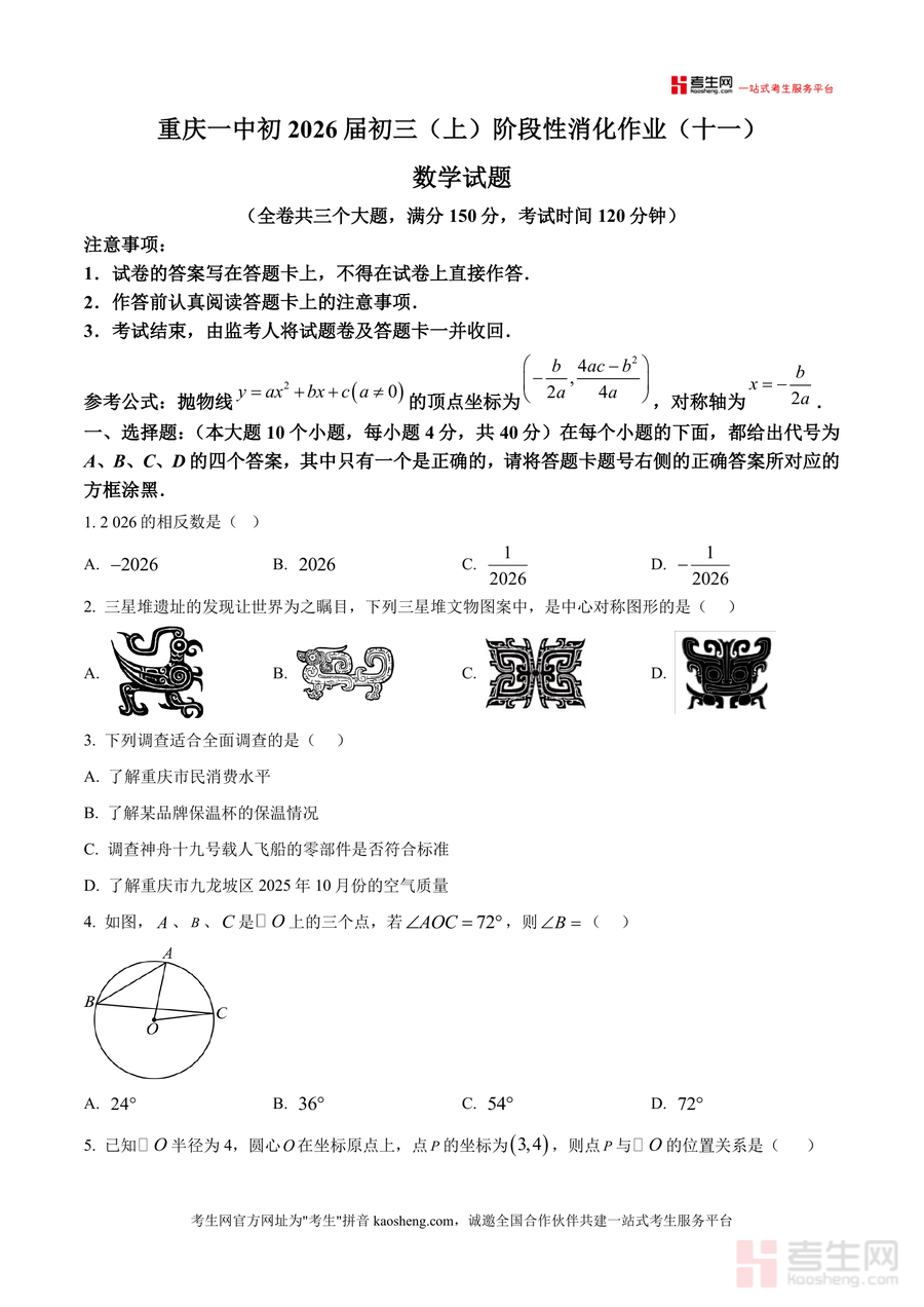 《精品解析:重庆市第一中学校2025-2026学年九年级上学期阶段性消化作业(十一)周考数学试题(原卷版).docx》是一份重庆一中初2026届九年级上学期第十一周数学周考原题资料。其内容严格遵循学校阶段性消化作业命题逻辑,包含选择题(10小题40分)、填空题(6小题24分)及解答题(9小题86分)三大板块;覆盖代数基础(相反数、因式分解)、几何核心(中心对称图形、圆性质、菱形判定)、统计概率(调查类型、概率计算)及二次函数应用、几何变换等中考高频考点;同时保留原卷答题规范提示与参考公式贴合学校教学进度与难度梯度。