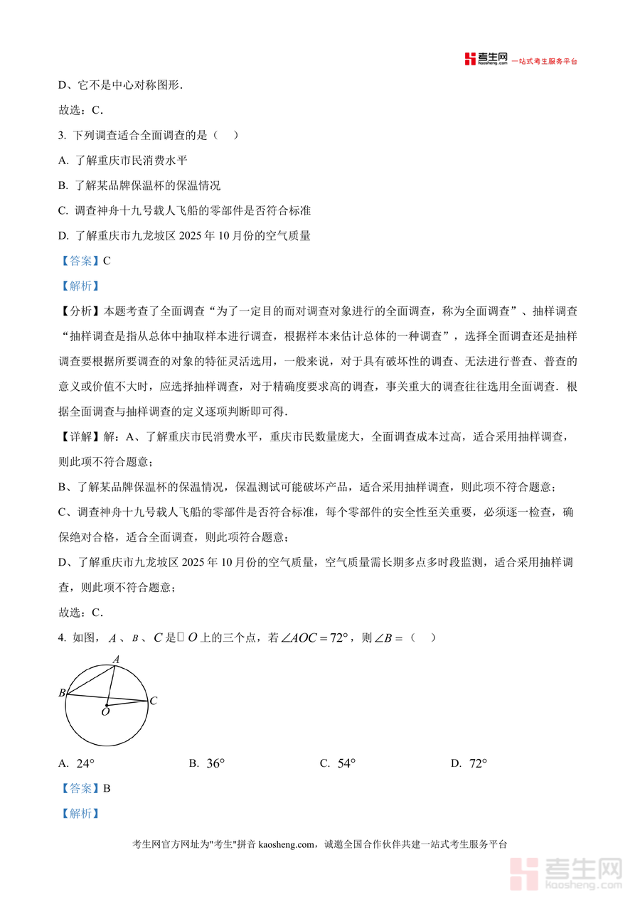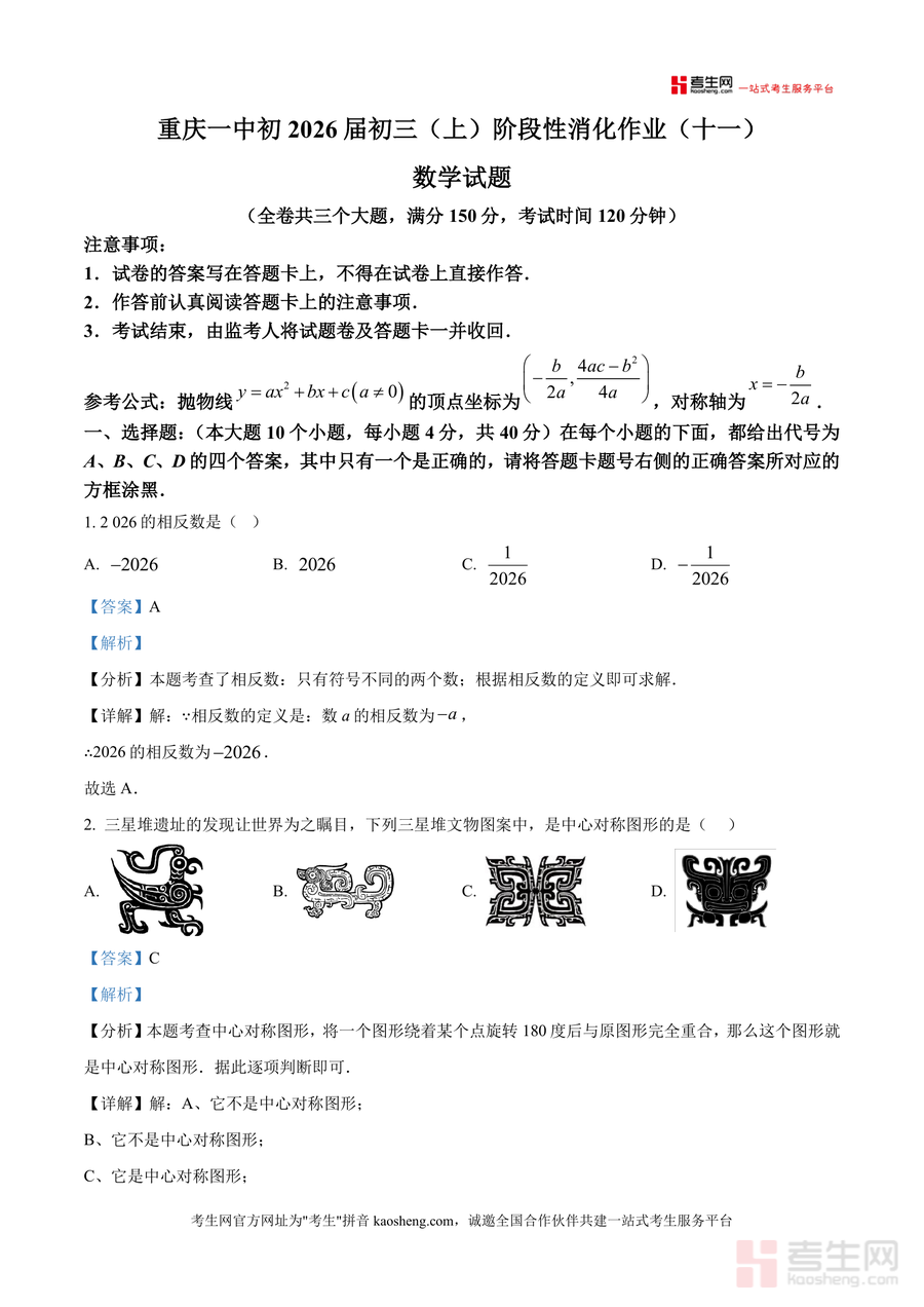 《精品解析:重庆市第一中学校2025-2026学年九年级上学期阶段性消化作业(十一)周考数学试题(解析版).docx》是一份针对重庆一中初2026届九年级学生阶段性数学复习需求设计的备考资料。该资料包含完整周考试题及逐题详细解析,覆盖相反数概念、中心对称图形识别、全面调查与抽样调查判断等基础考点,以及圆周角定理、垂径定理、二次函数图像性质、相似三角形应用等核心知识模块。其特色在于解析部分不仅提供标准答案,还融入考点溯源、解题思路推导及易错点警示,帮助学生深入理解数学原理而非单纯记忆解法,实现从"会做"到"会想"转变。