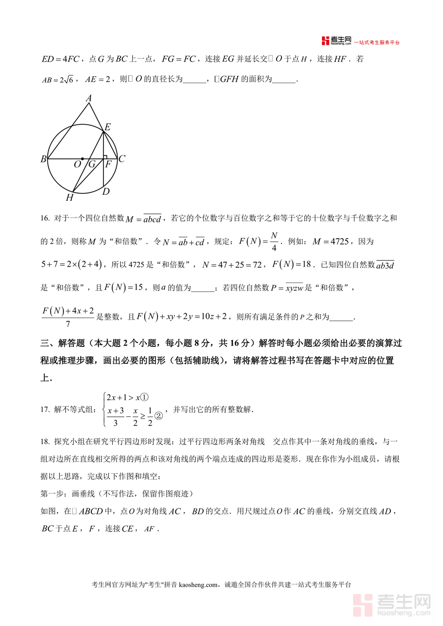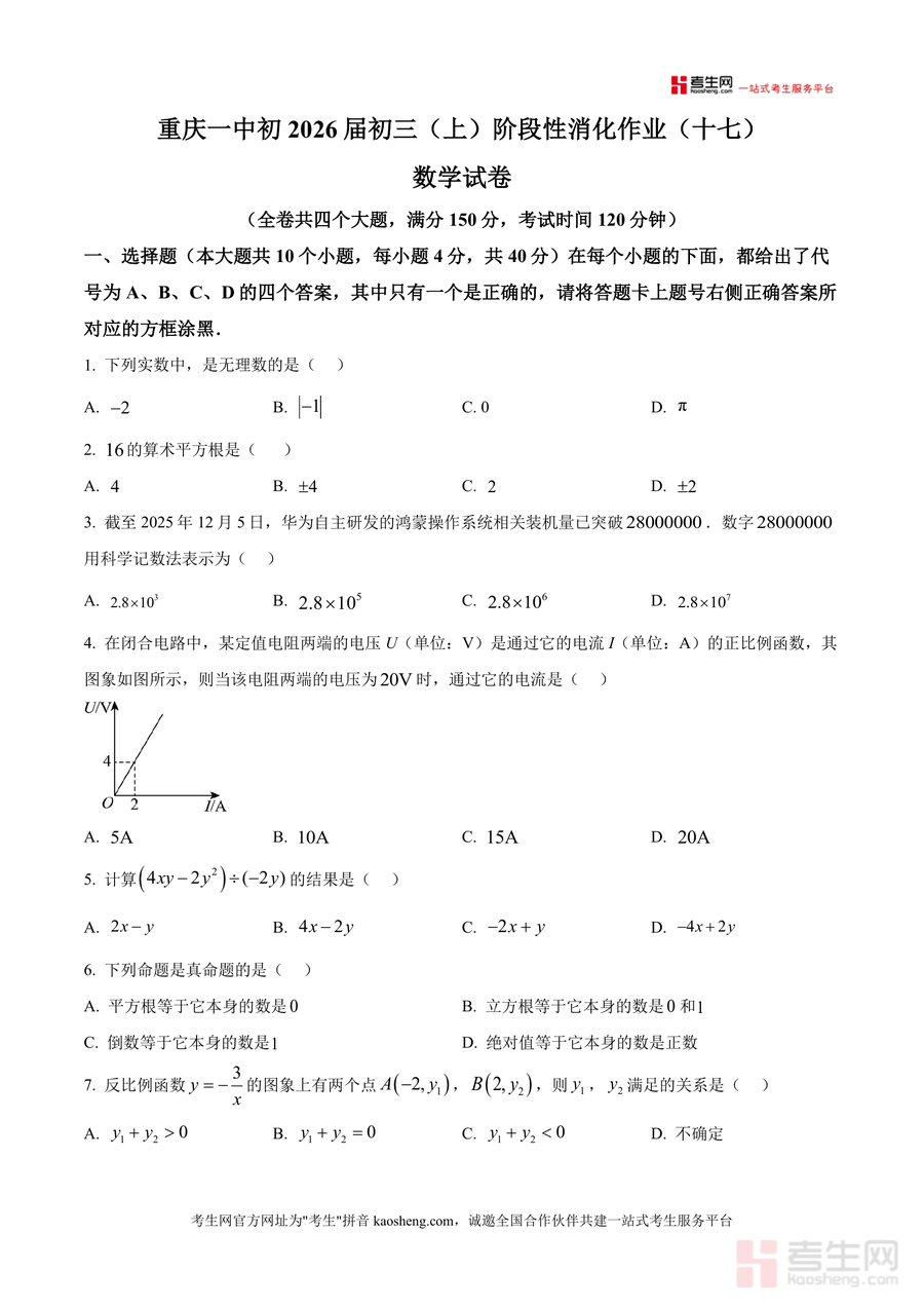 《精品解析:重庆市第一中学校2025-2026学年九年级上学期阶段性消化作业(十七)周考数学试题(原卷版).docx》是一份聚焦九年级数学阶段性检测的高质量备考资料。该资料严格依据重庆一中教学进度与中考数学考纲编制,包含选择题(10题40分)、填空题(6题24分)及解答题(9题86分)等完整题型结构。内容覆盖无理数识别、算术平方根运算、科学记数法表示大数、函数关系应用、几何图形证明与计算等核心知识点,并融入华为鸿蒙装机量统计、文创羽绒服销售等现实情境题目,既夯实基础又培养学生知识迁移能力。