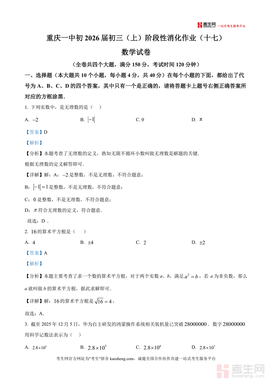 《精品解析:重庆市第一中学校2025-2026学年九年级上学期阶段性消化作业(十七)周考数学试题(解析版).docx》是一份针对重庆一中初三年级上学期第十七周数学周考编写,聚焦阶段性知识巩固与应试能力提升备考资料。文件涵盖全卷四个大题(选择题10题、填空题6题、解答题2题)共150分内容,每个题目均配备详实解析:包括考点定位(如无理数定义、算术平方根、科学记数法等)、分步解题过程、易错点警示及同类题型拓展提示,尤其对几何综合题(如正方形辅助线构造)和函数应用题(如正比例函数实际应用)的解题逻辑进行深度拆解,助力学生掌握核心解题方法。