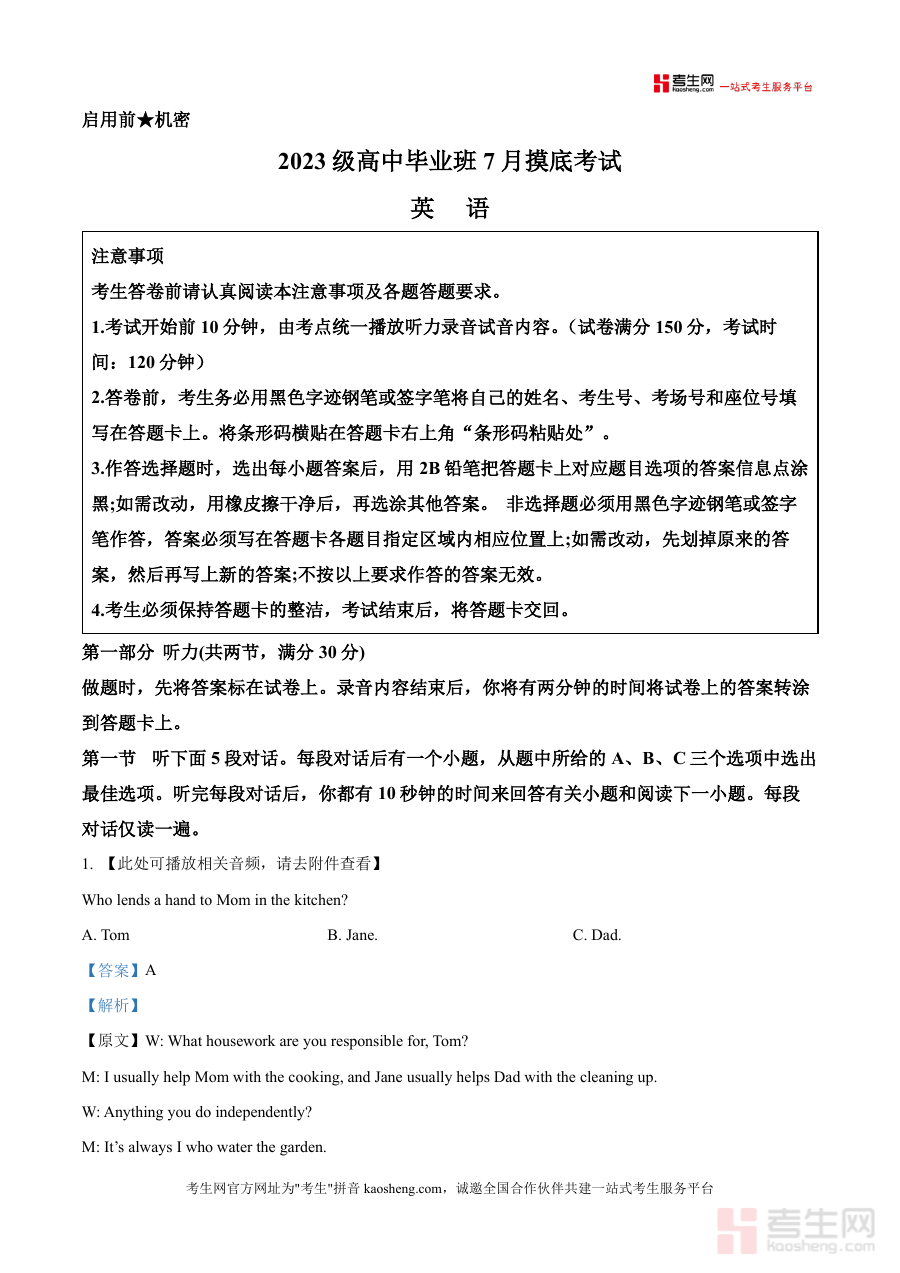《精品解析:湖南长郡中学等3校2025-2026学年高中毕业班7月摸底联考英语试题(解析版).docx》是一份针对高三学生英语备考的权威真题解析资料,由湖南长郡中学等三所知名高中联合命题,包含完整的摸底联考英语试卷及详尽的题目解析。资料涵盖听力、阅读、写作等全题型(示例中重点呈现听力部分),每道题均配有原文文本(如听力对话/独白)、准确答案及深度解析,清晰展示解题思路与考点分布。其特色在于依托名校命题资源,题型设置贴合高考趋势,解析内容专业详实,能有效帮助学生理解命题逻辑与答题技巧。