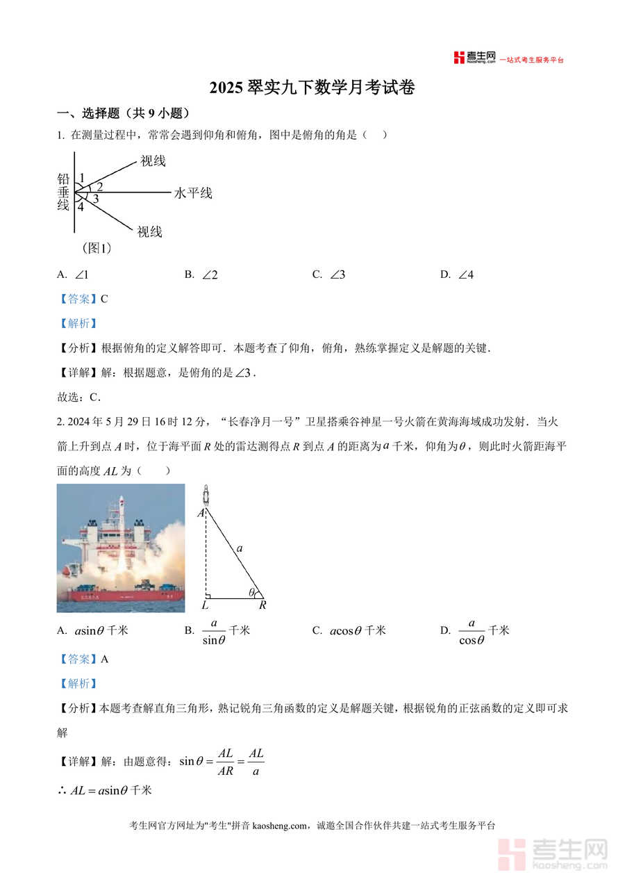 该资料核心用途为九年级学生备考数学月考提供针对性支持,适用于课前预习巩固考点、课后复习强化解题能力及考前模拟训练场景。用户价值体现在通过本地校考真题解析掌握命题趋势,强化应试能力;解答题部分规范的步骤拆解能帮助学生养成良好答题习惯,减少非知识性失分。备考优势显著:贴合该校教学进度与月考难度要求,解析突出高频考点如仰角俯角问题、坡度计算等,助力学生快速突破薄弱环节,提升备考效率。