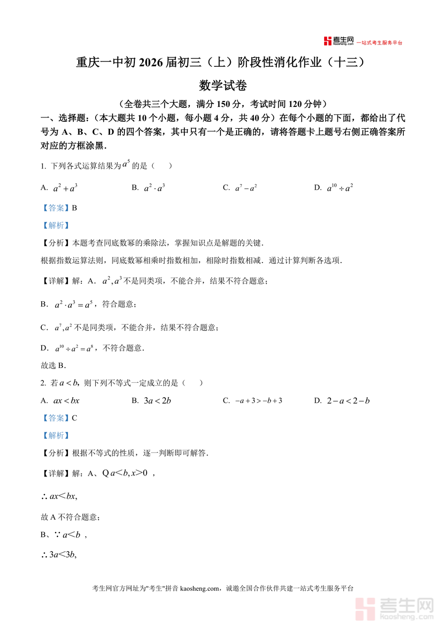 《精品解析:重庆市第一中学校2025-2026学年九年级上学期阶段性消化作业(十三)周考数学试题(解析版).docx》是一份针对重庆一中初2026届九年级上学期第十三周周考数学试题编写专业解析资料,涵盖全卷三大题(选择、填空、解答题)共16道题目及详细解析,核心亮点包括精准定位每道题的考点如指数运算、不等式性质、因式分解等,规范书写解题步骤与思路分析,标注易错点与答题技巧提示,助力学生深度理解考点本质与命题逻辑。