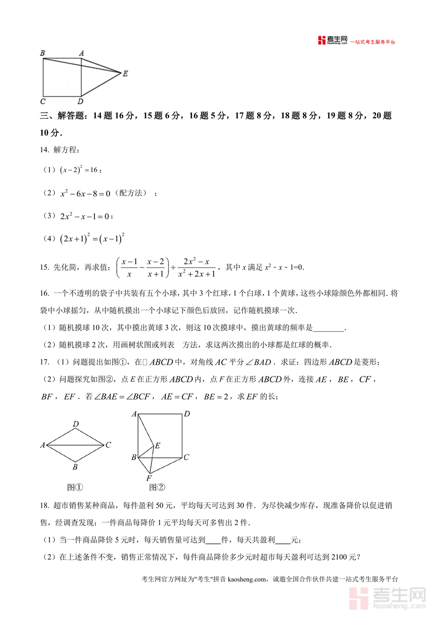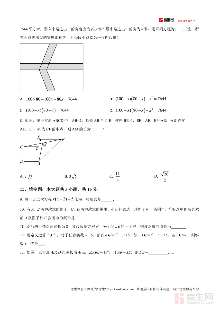 《精品解析:广东省深圳市龙岗区同心实验学校2025-2026学年九年级上学期10月月考数学试卷(原卷版)》是一份针对深圳龙岗区本地校考的九年级数学阶段性测评资料。该资料完整呈现了2025-2026学年上学期十月学业素养评价原卷内容,包含选择题8道、填空题5道及解答题7道,覆盖一元二次方程解法、特殊四边形性质与判定、概率计算、几何证明、实际应用问题及新定义题型等九年级上册核心知识点。其特色在于严格保留原卷题型结构与难度梯度,贴合同心实验学校教学进度与学情,为使用者提供真实考试场景模拟载体,助力精准把握校考命题方向。