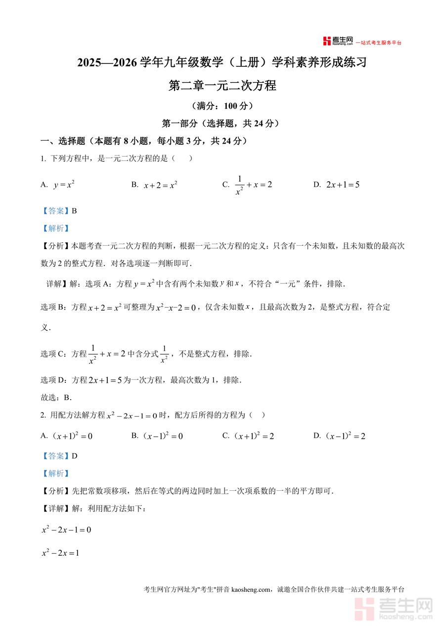 《精品解析:广东省深圳市龙岗区宏扬学校2025-2026学年九年级上学期10月月考数学试题(解析版).docx》是一份聚焦九年级上册一元二次方程核心考点真题解析类备考资料,涵盖选择题、填空题、解答题三大题型共19道题目。该资料特色在于每道题配备详实解析,包含考点定位(如一元二次方程定义、配方法、根判别式等)、解题步骤拆解及易错点提醒,同时融入实际应用场景题目解析(如增长率问题、几何面积问题),帮助使用者深入理解考点本质与命题逻辑。