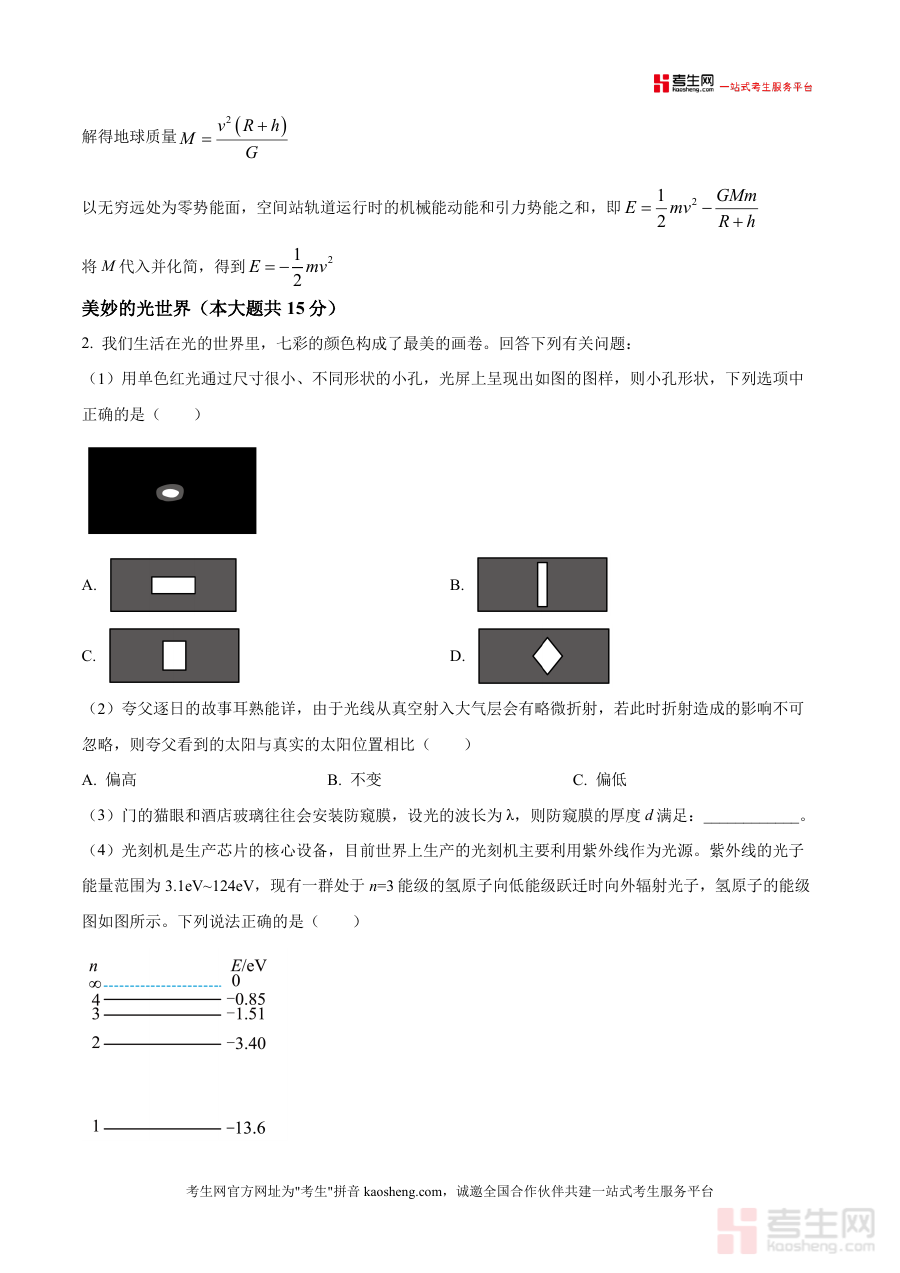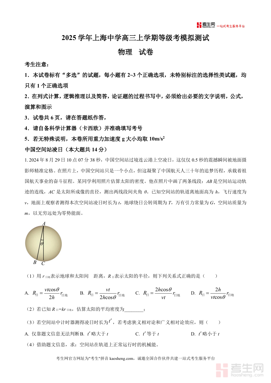 《精品解析:2026届上海市上海中学高三上学期模拟预测物理试题(解析版)》是一份针对上海中学高三学生物理等级考备考的高质量真题解析类备考资料,内容覆盖天体物理计算、光学现象分析、电磁学应用、力学综合等等级考核心模块,包含中国空间站凌日相关万有引力与相对论问题、光世界衍射干涉及氢原子能级分析、饮料机涉及电容触摸屏与动量定理应用、化学电池与超级电容器电路分析及电子偏转运动规律等贴近科技前沿与生活场景设计题目,特色亮点在于每道题均配有详细步骤解析,如天体密度估算中的几何关系推导与公式联立、光衍射图样与小孔形状关联分析等,帮助学生清晰掌握解题逻辑与方法.