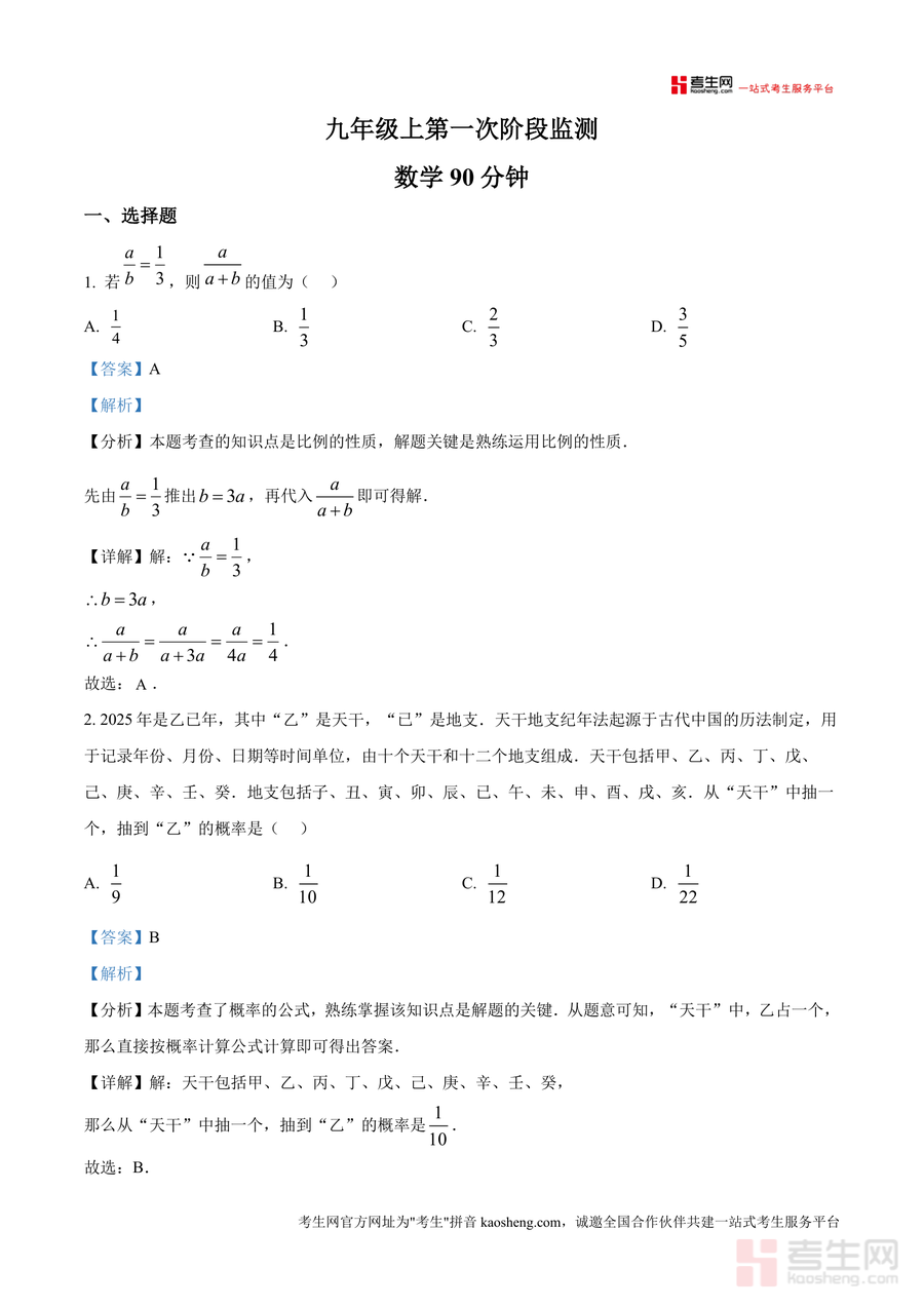 《精品解析:广东省深圳市龙岗区科技城外国语学校2025-2026学年九年级上学期10月月考数学试卷(解析版).docx》是一份针对深圳本地九年级阶段性数学检测设计精准备考资料。该资料覆盖试卷全部题型——选择题、填空题及解答题的详细解析,每道题均明确标注核心考点(如比例性质、概率计算、一元二次方程应用等),并通过"分析-详解-点睛"三步法拆解解题逻辑:例如选择题中天干地支概率题清晰阐释古典概型公式应用,解答题中增长率问题强调一元二次方程建模思路。特色亮点在于结合深圳本地教学大纲,融入杨辉《田亩比类乘除算法》等数学文化元素,兼顾知识深度与学科素养培养,为学生提供全面且专业的备考支持。