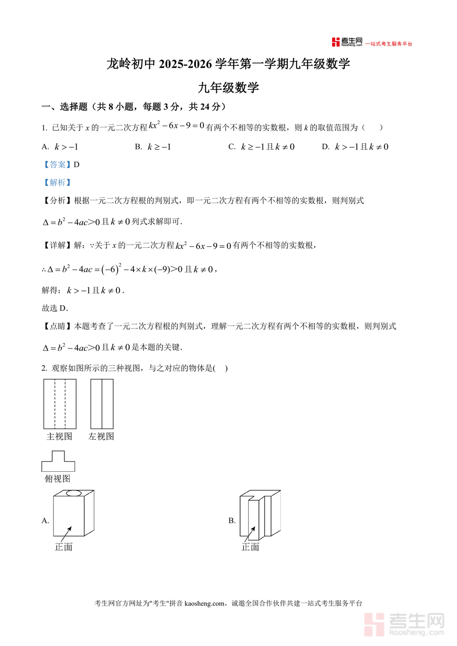 《精品解析:广东省深圳市龙岗区龙岭学校2025-2026学年九年级上学期12月月考数学试卷(解析版).docx》是一份针对深圳龙岗龙岭学校九年级上学期数学月考设计的精准真题解析资料。文件覆盖选择题、填空题、解答题三大题型共15道核心题目,包含一元二次方程根判别式、三视图识别、位似图形性质、平行四边形及特殊四边形判定、解直角三角形应用、二次函数图像与性质等九年级上学期重点考点。每道题配备完整解析流程——含考点分析明确考察方向、详细解答步骤展示解题逻辑、点睛提示总结易错点及解题技巧,形成"考点+方法+技巧"三位一体式解析体系,为学生提供专业真题解析支持。