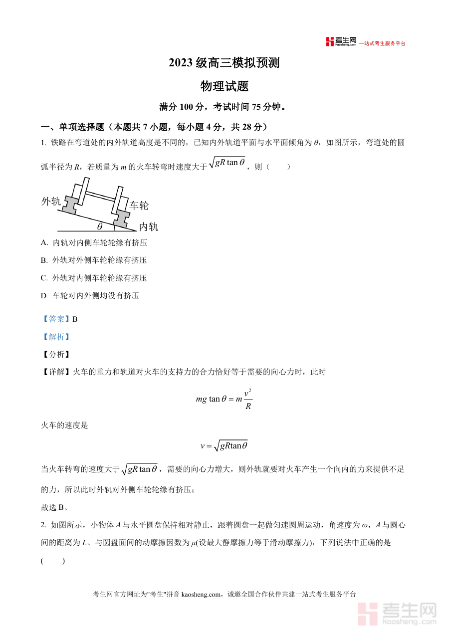 《精品解析:2026届四川省仁寿第一中学校(北校区)高三上学期模拟预测物理试题(解析版).docx》是一份聚焦高三物理核心考点 的高质量备考资料,内容涵盖单项选择(7小题)、多项选择(3小题)及实验题(2小题)三大题型,涉及圆周运动、平抛运动、牛顿运动定律、匀变速直线运动等高频考点;其特色亮点在于每道试题均配备深度解析,包含题干分析、选项正误判断依据、公式推导过程及易错点提示,如对火车转弯时向心力来源问题采用受力分解法清晰呈现,对平抛运动实验 的数据处理方法进行步骤化拆解,助力使用者精准把握解题逻辑。