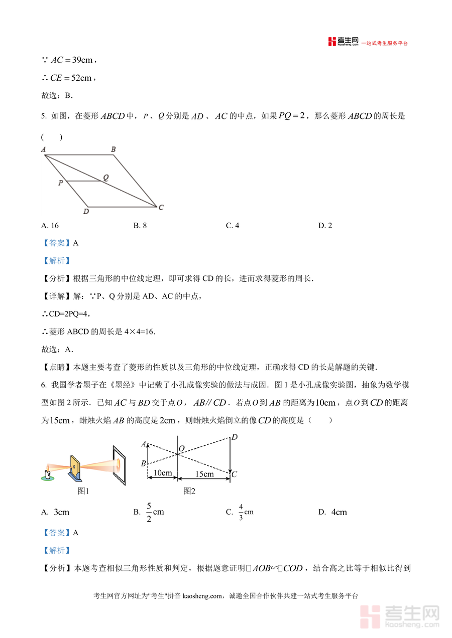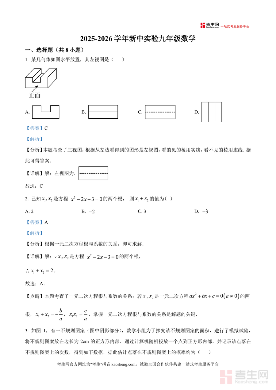 《精品解析:广东省深圳新安中学第一实验学校2025-2026学年上学期九年级数学1月月考试卷(解析版).docx》是一份针对该校九年级学生数学月考设计真题解析资料,涵盖选择题8道、填空题5道及解答题7道,覆盖几何三视图判断、相似三角形应用、菱形与正方形性质等图形板块,代数一元二次方程解法及根与系数关系等方程板块,统计概率频率估计概率、列表法求概率等统计板块核心考点。其特色亮点在于每道题配备详细考点标注与解题思路梳理——如选择题中小孔成像问题结合相似三角形判定与性质分析,填空题比例性质应用采用设参数法直观呈现,解答题方程解法步骤规范清晰,帮助学生快速把握解题逻辑。