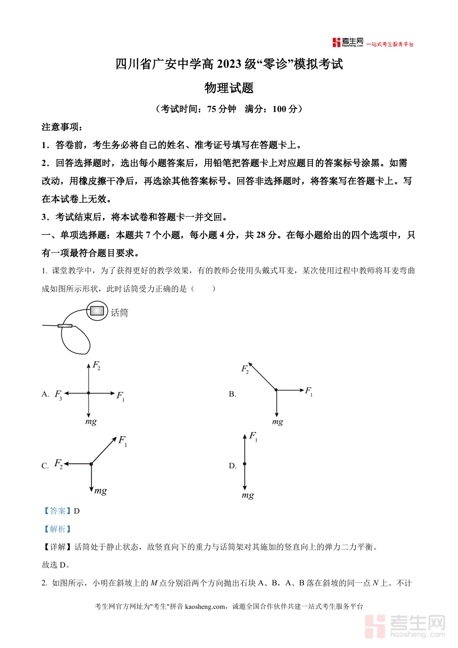 《精品解析:2026届四川省广安中学高三上学期模拟预测物理试题(解析版).docx》是一份针对高三物理备考阶段设计的高质量真题解析类备考资料,包含7道单项选择题、3道多项选择题及5道非选择题,覆盖受力分析、抛体运动、电磁感应、简谐运动等核心考点,每个题目均配备详细解题思路与选项正误分析——如话筒受力题解析了静止状态下二力平衡应用,抛体运动题对比AB石块运动时间、速度变化量及平均速度差异,帮助学生理解物理规律本质。资料结合广安中学教学实际与高考命题趋势,注重易错点剖析与应试技巧提炼,助力学生深化对物理概念的理解与应用能力提升。