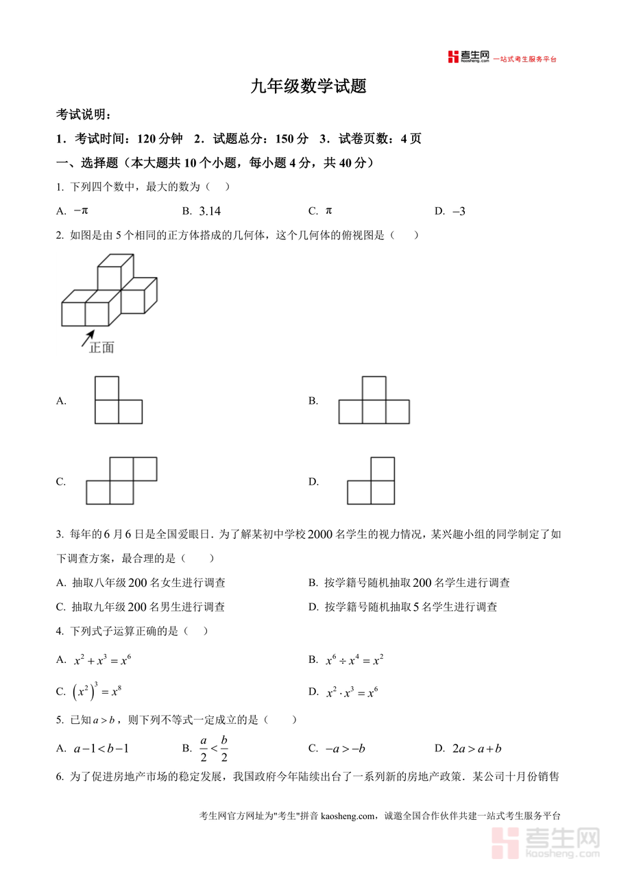 《精品解析:重庆市第十八中学2025-2026学年九年级上学期第1次月考数学试题(原卷版)》是一份针对九年级上学期数学首次月考设计的高质量备考资料。文件包含规范考试说明(考试时长120分钟、试卷总分150分、共4页)及完整题型结构:选择题(10小题共40分)涵盖数与式、几何视图等基础考点;填空题(6小题共24分)涉及方程根、多边形外角等核心知识;解答题分为基础类(2小题共16分)与综合类(7小题共70分)覆盖不等式组求解、统计分析、函数应用及几何证明等模块。其特色亮点在于精准匹配重庆十八中教学进度与命题导向,题目设置梯度合理,能全面考查学生知识掌握程度与思维能力。
