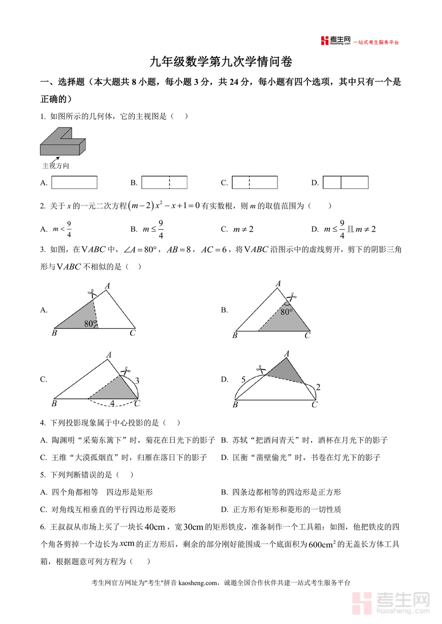 《精品解析:广东省深圳松岗中学2025--2026学年上学期九年级数学第九次学情问卷(原卷版)》是一份聚焦九年级数学核心知识与能力评估的阶段性检测资料。该资料涵盖九年级数学上册关键知识模块,包括几何图形视图与投影、一元二次方程实数根条件分析、相似三角形判定与性质应用、特殊四边形性质辨析、反比例函数图象及综合应用、概率统计计算等内容;题型设置包含选择题、填空题、解答题三大类共20道题目,与中考题型结构高度匹配。其特色亮点在于紧密贴合松岗中学教学进度与本地考情导向,题目设计兼顾基础巩固与能力拓展,能有效反映学生对重点知识的掌握深度及解题思维水平。