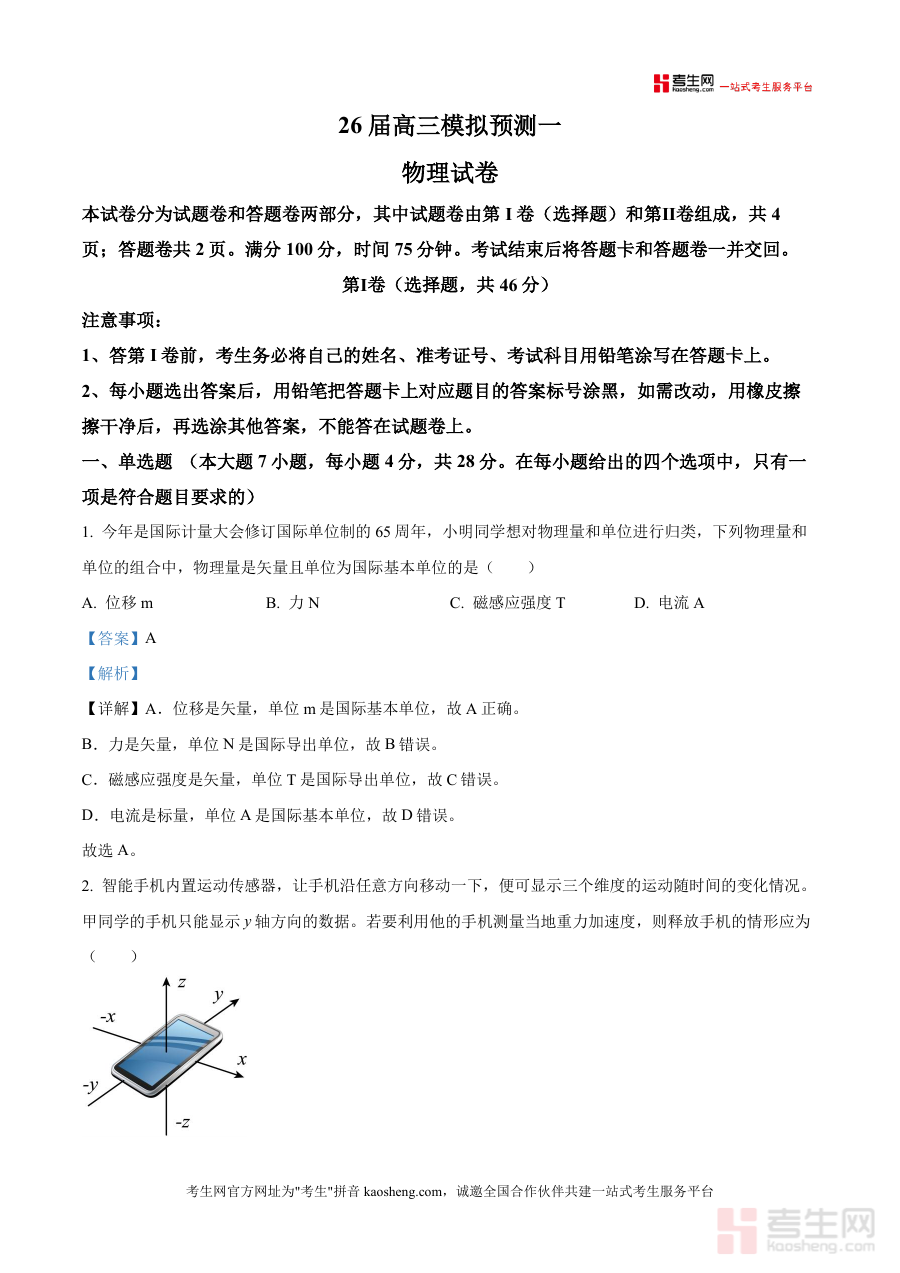 《精品解析:2026届四川省眉山中学校高三上学期模拟预测一物理试题(解析版).docx》是一份针对高三物理备考的优质真题解析资料,主要包含26届高三物理模拟预测一的完整试题及详细解析。该资料严格按照高考物理考试大纲设计,涵盖了力学、运动学、电磁学等核心知识点,每个题目都配有详尽解答,包括解题思路分析、关键公式应用及易错点提醒,尤其注重对物理概念理解和解题方法的指导,能够有效帮助学生掌握物理知识体系和应试技巧。