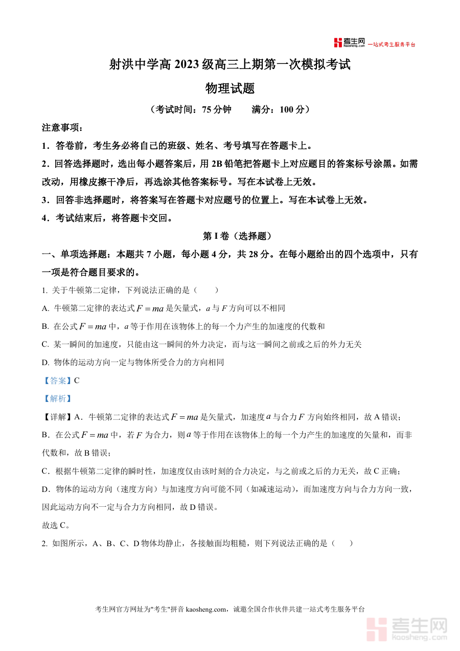 本资料适用于2026届高三物理备考学生(尤其是射洪中学及周边同类学校学生)、高中物理教师及教研人员。作为一轮复习阶段重要资料,其必要性体现在精准匹配本地教学进度与命题风格,填补通用资料与本地学情差距;不可替代性在于包含射洪中学内部模拟试题独家专业解析,针对性极强;长期价值表现为可作为后续复习的错题回顾素材与知识体系构建依据,助力使用者高效备考,稳步提升物理学科核心素养与应试成绩。