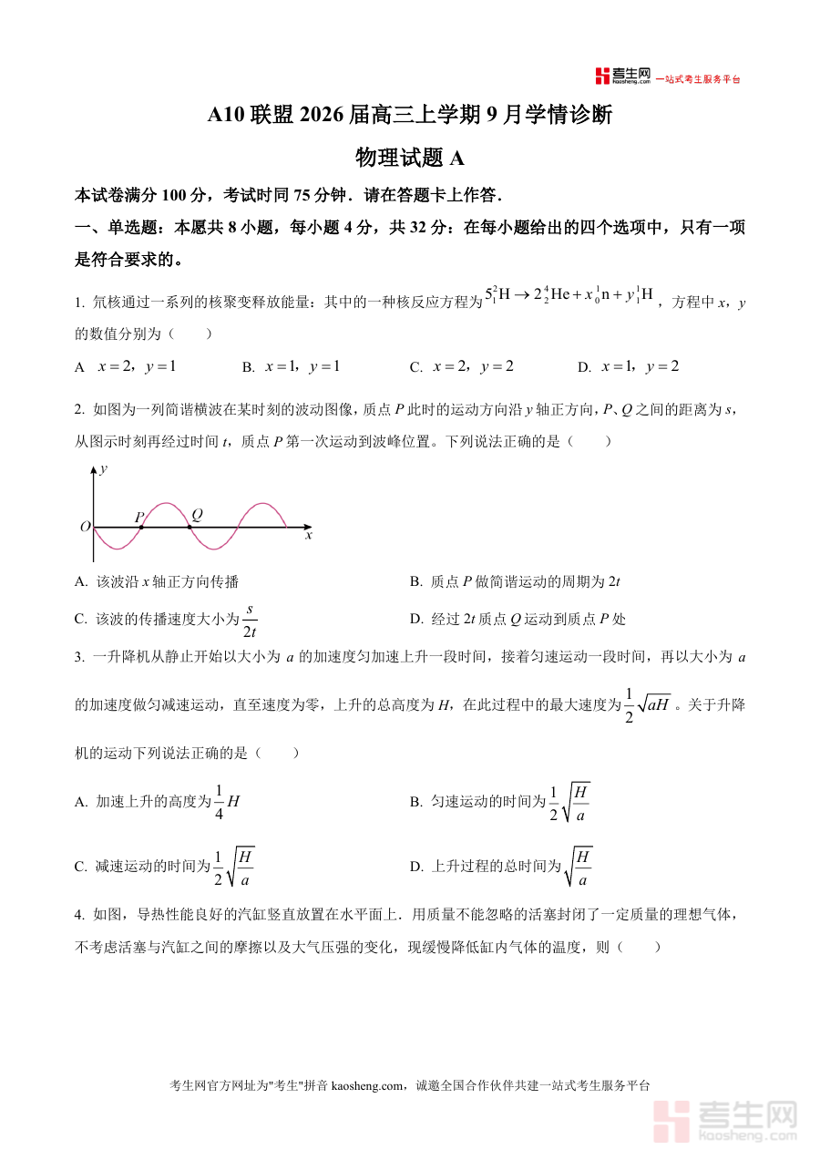 《精品解析:2026届安徽省A10联盟高三上学期9月底学情诊断物理试题(原卷版)docx》是一份聚焦高三物理一轮复习初期学情检测需求的权威备考资料,由安徽省A10联盟命题组依据高考物理考纲及本地教学实际编制。内容涵盖力学、电磁学、热学、光学等核心知识模块,题型设置包含8道单选题、2道多选题及5道非选择题(含实验探究与综合计算类题型),严格遵循高考分值分布与命题规范,能精准反映学生对基础知识的掌握程度及知识迁移应用能力。其特色在于保留原卷真实排版与考试情境,考点分布贴合高三初期复习进度,为使用者提供沉浸式测试体验。