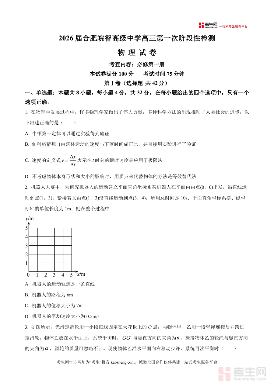 《精品解析:2026届安徽省合肥皖智高级中学高三上学期第一次阶段性检测物理试卷(原卷版)》是一份针对高三物理一轮复习初期设计的阶段性检测原卷资料。该试卷考查范围聚焦必修第一册核心内容,涵盖质点运动、相互作用、牛顿运动定律等基础考点;题型设置包含单选题、多选题、实验题及计算题,严格遵循75分钟考试时长与100分满分的标准,贴合高考物理命题结构。其特色在于依托皖智高级中学教学实践经验,试题既注重基础概念辨析(如质点模型、极限法应用)又强化综合能力考查(如动力学计算、实验数据处理),能有效反映学生一轮复习初期对必修知识掌握程度,是备考资料中兼具代表性与实用性的数据载体。