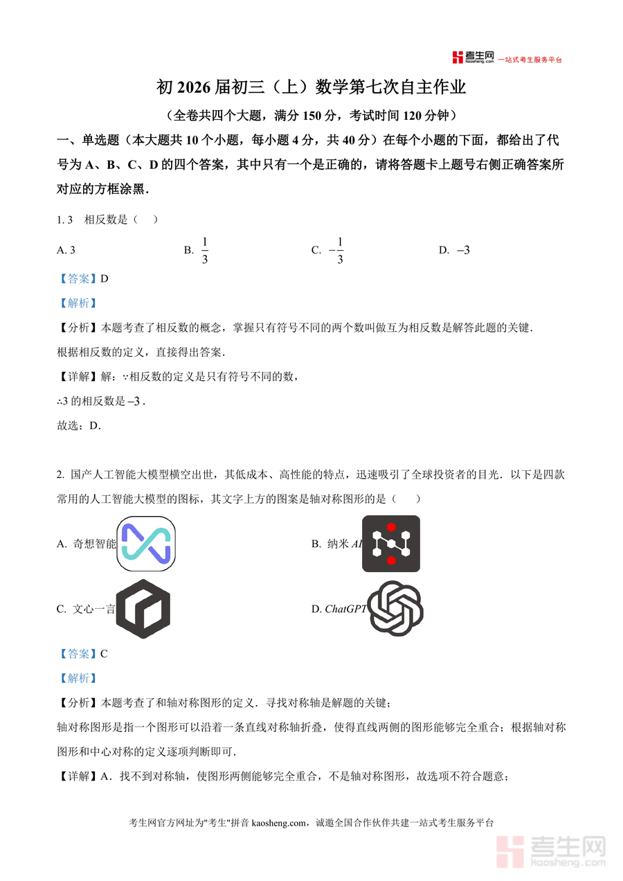 该资料核心用途在于辅助初三学生完成自主作业后的错题订正与知识复盘,适用场景包括日常复习巩固、考前针对性训练等。用户价值体现在通过真题解析快速定位知识漏洞(如第6题图形规律题训练逻辑归纳能力,第9题正方形综合题提升几何综合运用水平);备考优势在于精准匹配育才中学命题风格与难度梯度,帮助学生熟悉重点校自主作业考查方向,有效提升应试能力。