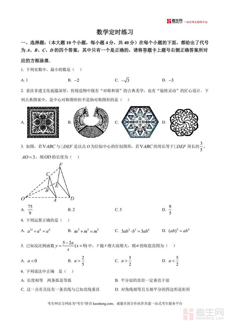 本试卷适用于重庆市及周边地区九年级学生、初中数学教师及中考备考家长群体。对学生而言,它是了解名校命题风格、巩固核心知识点的重要资料;对教师,它能提供优质题源与命题思路参考;对家长,则可辅助孩子进行精准复习。作为名校月考原卷版资料,其内容的权威性与实用性使其具备不可替代性,长期保存可作为中考复习阶段的经典训练素材,助力学生高效备考。