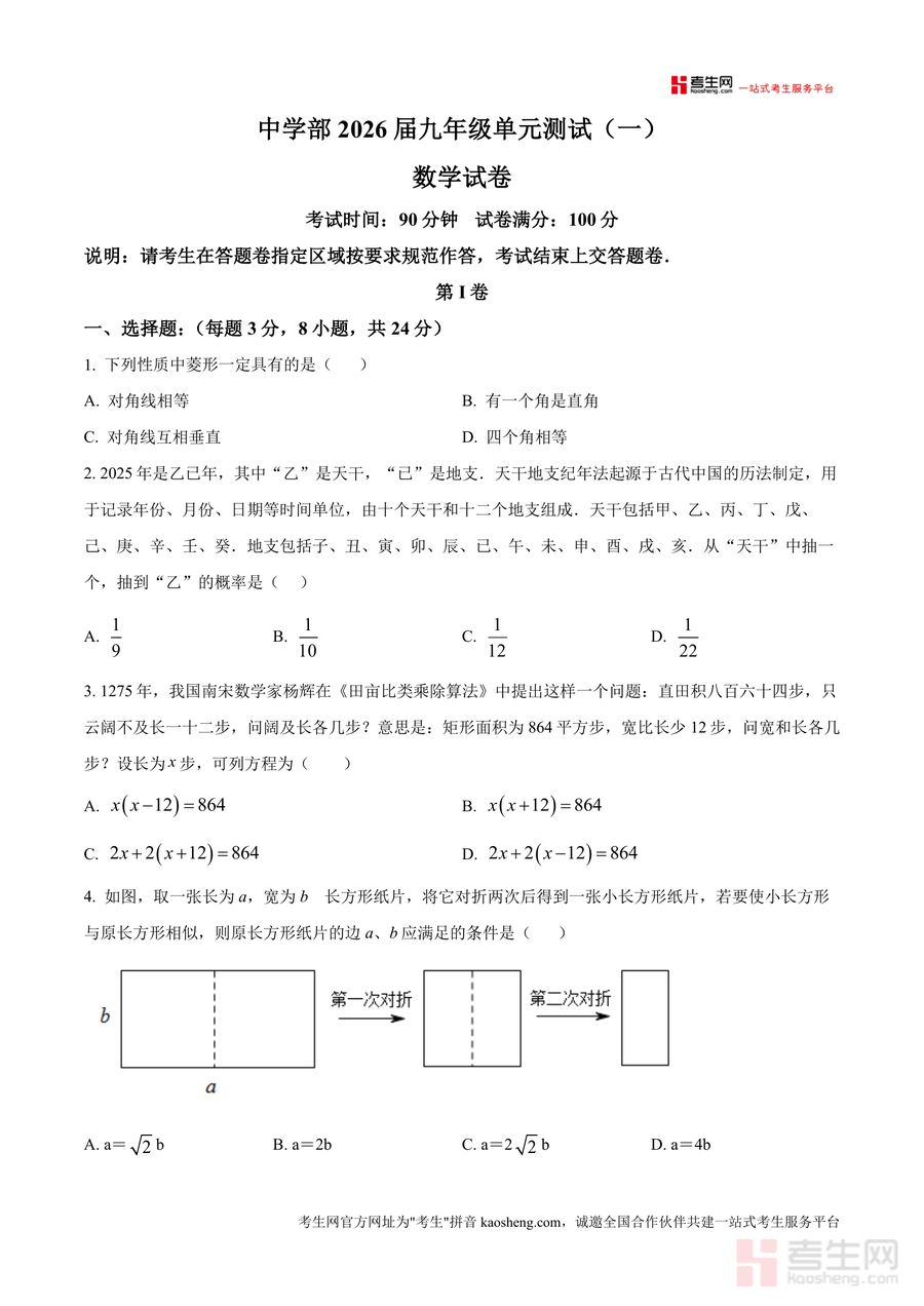 《精品解析:广东省深圳实验学校中学部2025-2026学年上学期九年级开学考数学试卷(原卷版).docx》是一份针对深圳实验学校2026届九年级学生开学考的专业数学备考资料。该试卷严格遵循该校教学大纲与命题风格,考试时长90分钟、满分100分,题型涵盖选择题(8小题共24分)、填空题(5小题共15分)及解答题(7小题共61分),覆盖菱形性质判断、概率计算、一元二次方程根判别式、相似三角形应用等九年级核心数学知识点。作为原卷版资料,其完整还原考试场景与题型结构,能帮助使用者精准把握该校开学考命题方向与难度梯度,是兼具权威性与实用性的备考资源。
