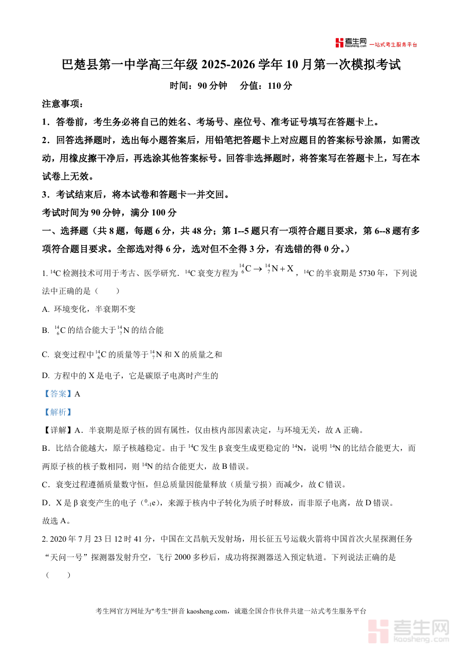 《精品解析:2026届新疆维吾尔自治区喀什地区巴楚县第一中学高三上学期模拟预测物理试题(解析版).docx》是一份针对高三物理备考阶段的高质量模拟试题解析资料,核心内容涵盖90分钟时长、满分110分的标准化模拟试卷及逐题详细解析,包含选择题(含单选与多选)、实验题及解答题三大题型模块。资料特色亮点在于紧密结合巴楚县一中高三教学实际与本地考情,解析过程不仅给出正确答案,更深入拆解知识点如半衰期特性、质点模型应用等,并融入解题思路与方法指导如机械能守恒定律实际运用,有效助力学生构建系统知识框架,提升应试能力。